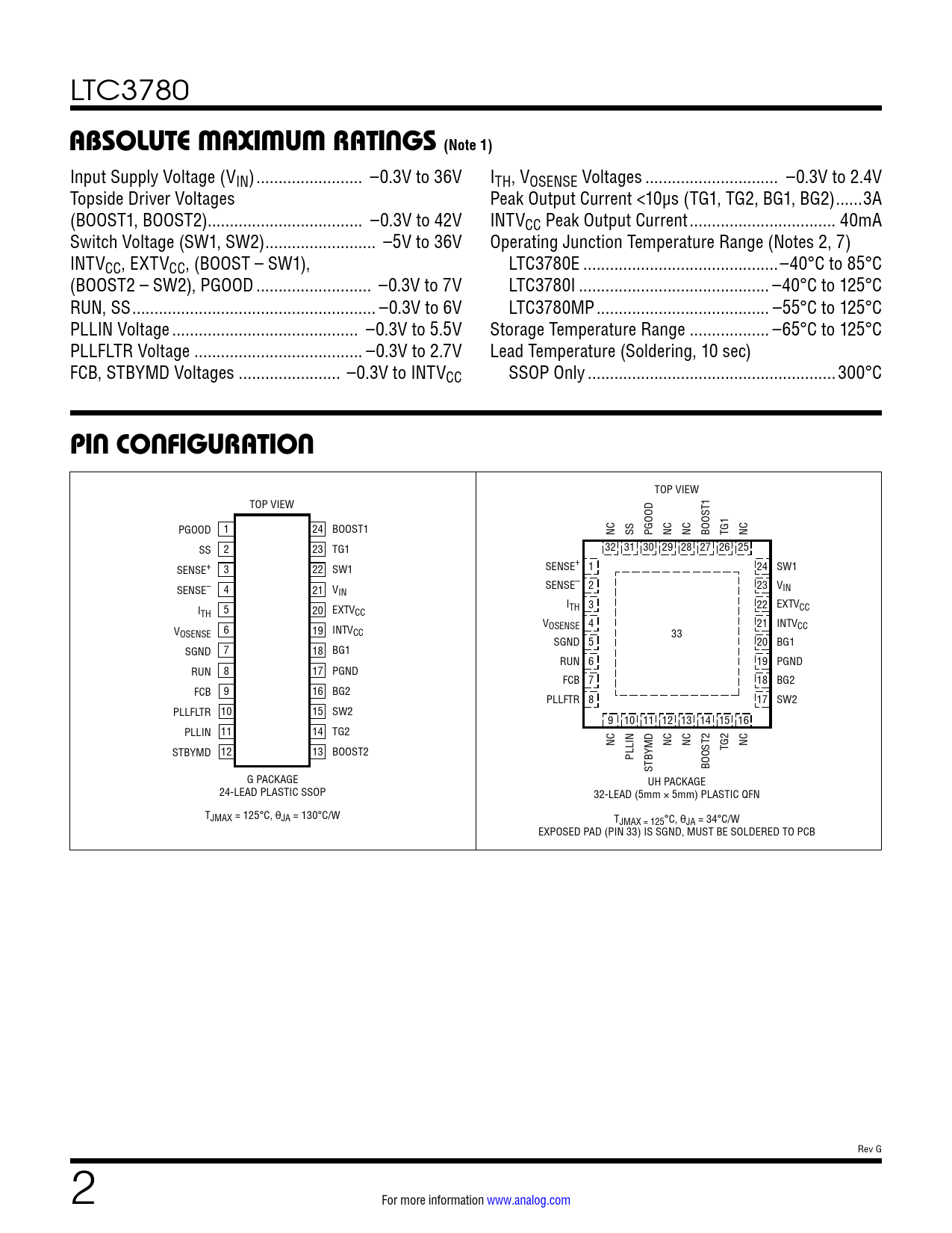 Input Supply Voltage (VIN) .. –0.3V to 36V ITH, VOSENSE Voltages .. –0.3V to 2.4V Topside Driver Voltages Peak Output Current <10µs (TG1, TG2, BG1, BG2) ..3A (BOOST1, BOOST2)... –0.3V to 42V INTVCC Peak Output Current ... 40mA Switch Voltage (SW1, SW2) ... –5V to 36V Operating Junction Temperature Range (Notes 2, 7) INTVCC, EXTVCC, (BOOST – SW1), LTC3780E ..–40°C to 85°C (BOOST2 – SW2), PGOOD .. –0.3V to 7V LTC3780I ... –40°C to 125°C RUN, SS ... –0.3V to 6V LTC3780MP ... –55°C to 125°C PLLIN Voltage .. –0.3V to 5.5V Storage Temperature Range .. –65°C to 125°C PLLFLTR Voltage .. –0.3V to 2.7V Lead Temperature (Soldering, 10 sec) FCB, STBYMD Voltages ... –0.3V to INTVCC SSOP Only ..300°C