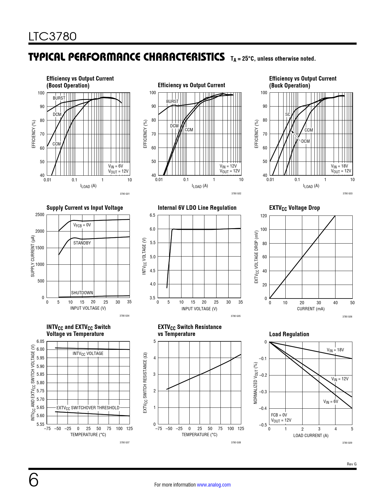 6.05 5 0 6.00 V INTV IN = 18V CC VOLTAGE 5.95 4 –0.1 5.90 (%) 5.85 3 OUT –0.2 VIN = 12V SWITCH VOLTAGE (V) 5.80 CC 5.75 2 –0.3 5.70 SWITCH RESISTANCE (Ω) CC NORMALIZED V VIN = 6V AND EXTV 5.65 EXTVCC SWITCHOVER THRESHOLD 1 –0.4 CC EXTV 5.60 FCB = 0V INTV VOUT = 12V 5.55 0 –0.5 –75 –50 –25 0 25 50 75 100 125 –75 –50 –25 0 25 50 75 100 125 0 1 2 3 4 5 TEMPERATURE (°C) TEMPERATURE (°C) LOAD CURRENT (A) 3780 G07 3780 G08 3780 G09 Rev G 6 For more information www.analog.com Document Outline Features Description Applications Typical Application Absolute Maximum Ratings Pin Configuration Order Information Electrical Characteristics Typical Performance Characteristics Block Diagram Operation Applications Information Typical Application Related Parts Features Applications Typical Application Description Absolute Maximum Ratings Pin Configuration Order Information Electrical Characteristics Typical Performance Characteristics Pin Functions Block Diagram Operation Applications Information Package Description Revision History Typical Application Related Parts