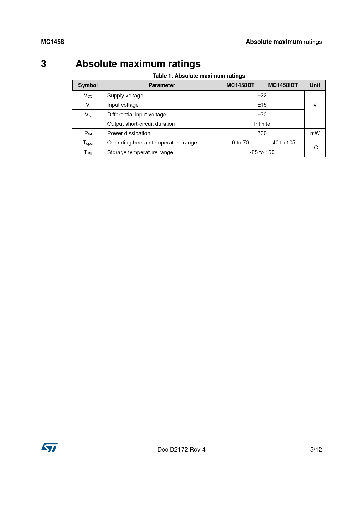 MC1458Absolute maximum ratings 3Absolute maximum ratingsTable 1: Absolute maximum ratingsSymbolParameterMC1458DTMC1458IDTUnit VCC Supply voltage ±22 Vi Input voltage ±15 V Vid Differential input voltage ±30 Output short-circuit duration Infinite Ptot Power dissipation 300 mW Toper Operating free-air temperature range 0 to 70 -40 to 105 °C Tstg Storage temperature range -65 to 150 DocID2172 Rev 4 5/12 Document Outline 1 Schematic diagram 2 Package pin connections 3 Absolute maximum ratings 4 Electrical characteristics 5 Package information 5.1 SO8 package information 6 Ordering information 7 Revision history