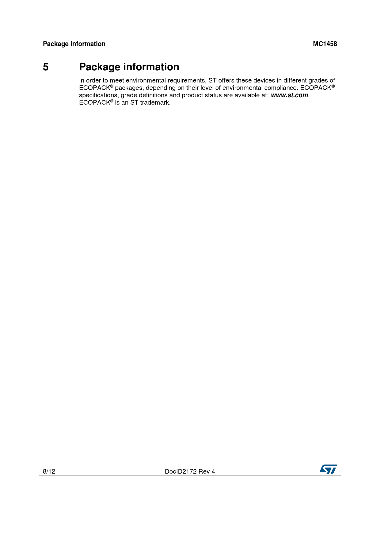 Package informationMC14585Package information In order to meet environmental requirements, ST offers these devices in different grades of ECOPACK® packages, depending on their level of environmental compliance. ECOPACK® specifications, grade definitions and product status are available at: www.st.com . ECOPACK® is an ST trademark. 8/12 DocID2172 Rev 4 Document Outline 1 Schematic diagram 2 Package pin connections 3 Absolute maximum ratings 4 Electrical characteristics 5 Package information 5.1 SO8 package information 6 Ordering information 7 Revision history