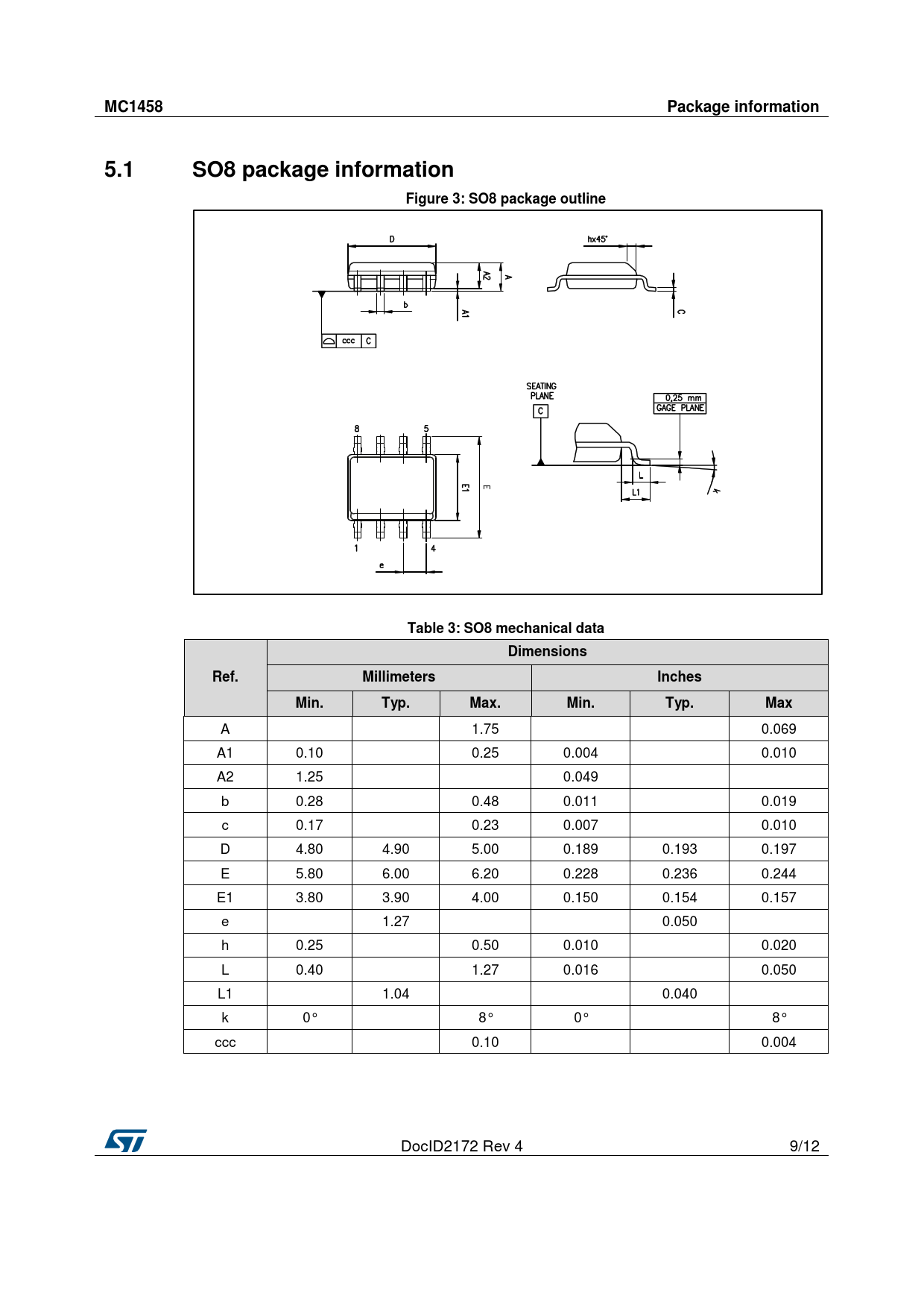 MC1458. Package information. 5.1. SO8 package information. Figure 3: SO8 package outline. Table 3: SO8 mechanical data. Dimensions