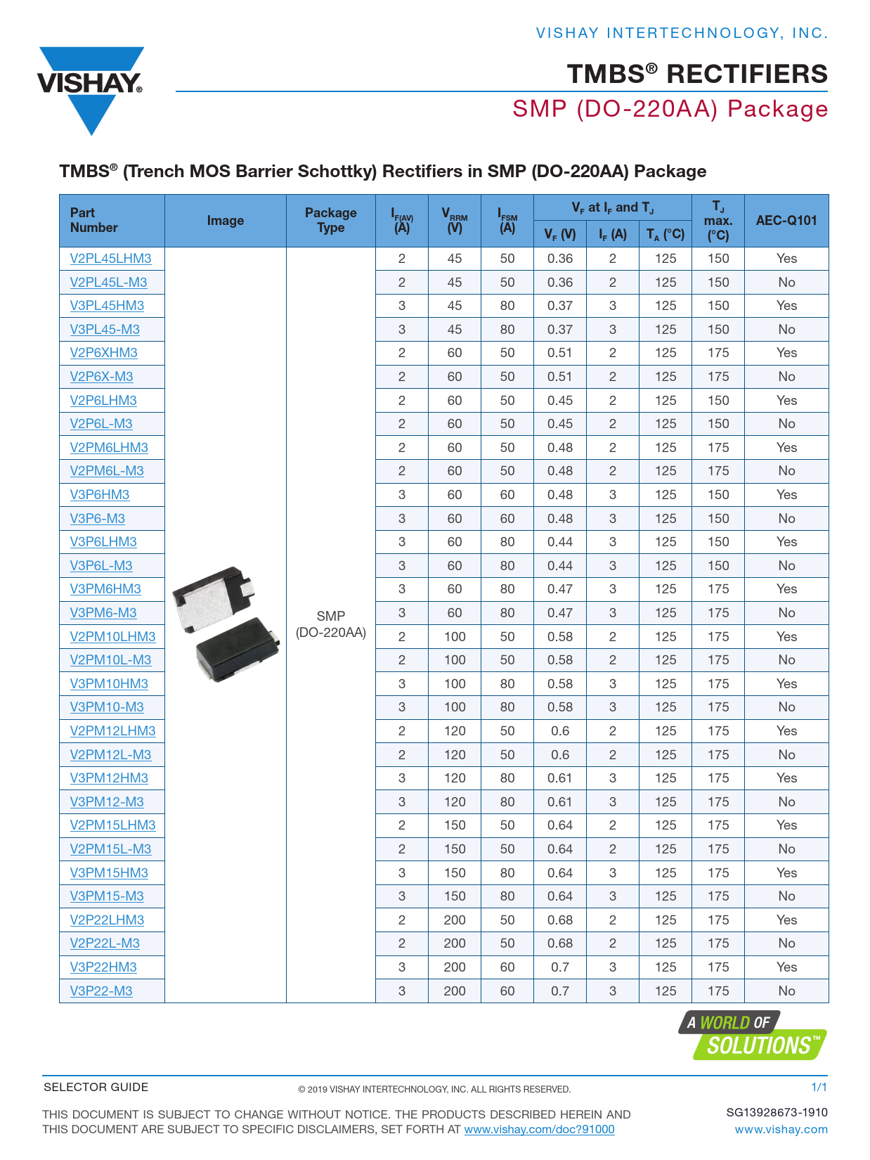 TMBS® RECTIFIERS. TMBS®. (Trench MOS Barrier Schottky) Rectifiers in SMP (DO-220AA) Package. Part. V at I and T. F(AV). RRM. FSM