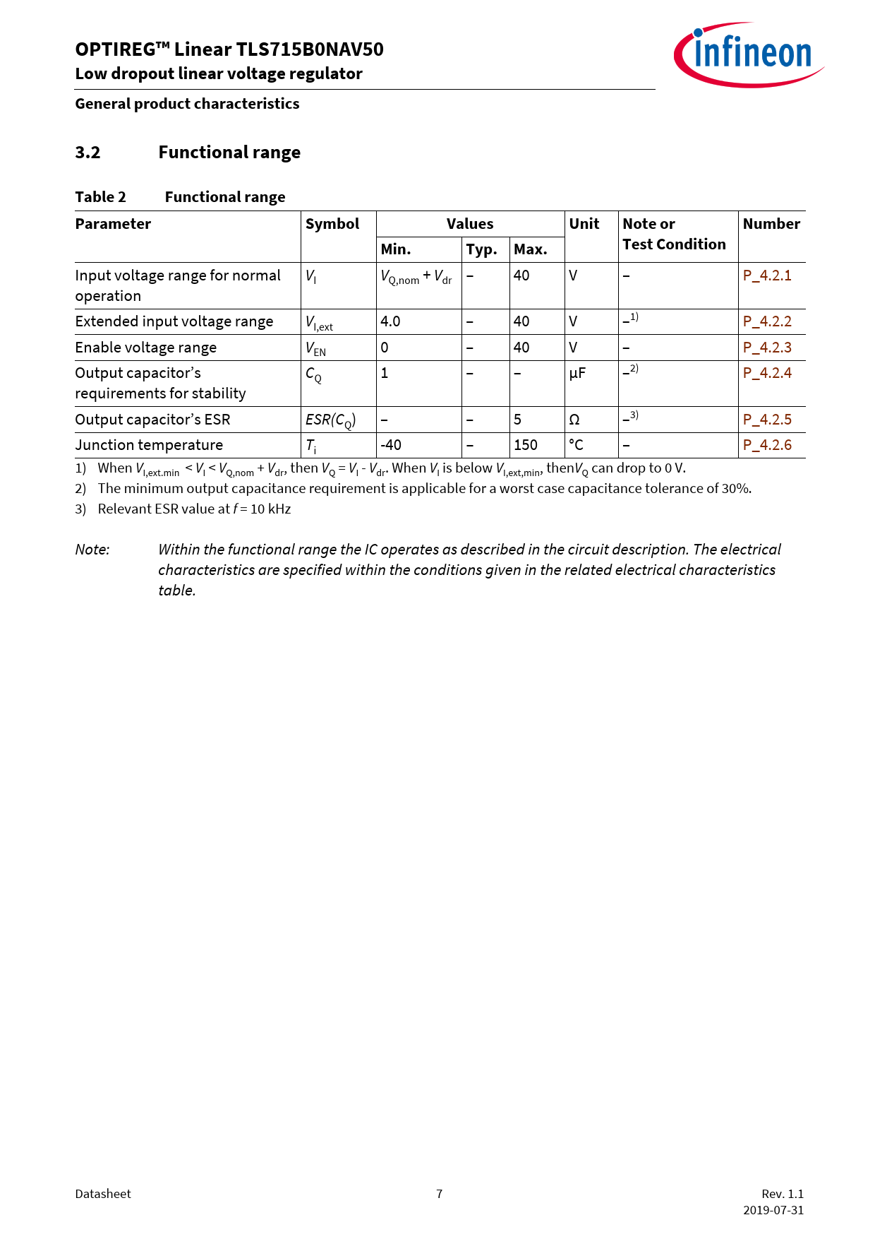 OPTIREG™ Linear TLS715B0NAV50 Low dropout linear voltage regulator General product characteristics. 3.2. Functional range