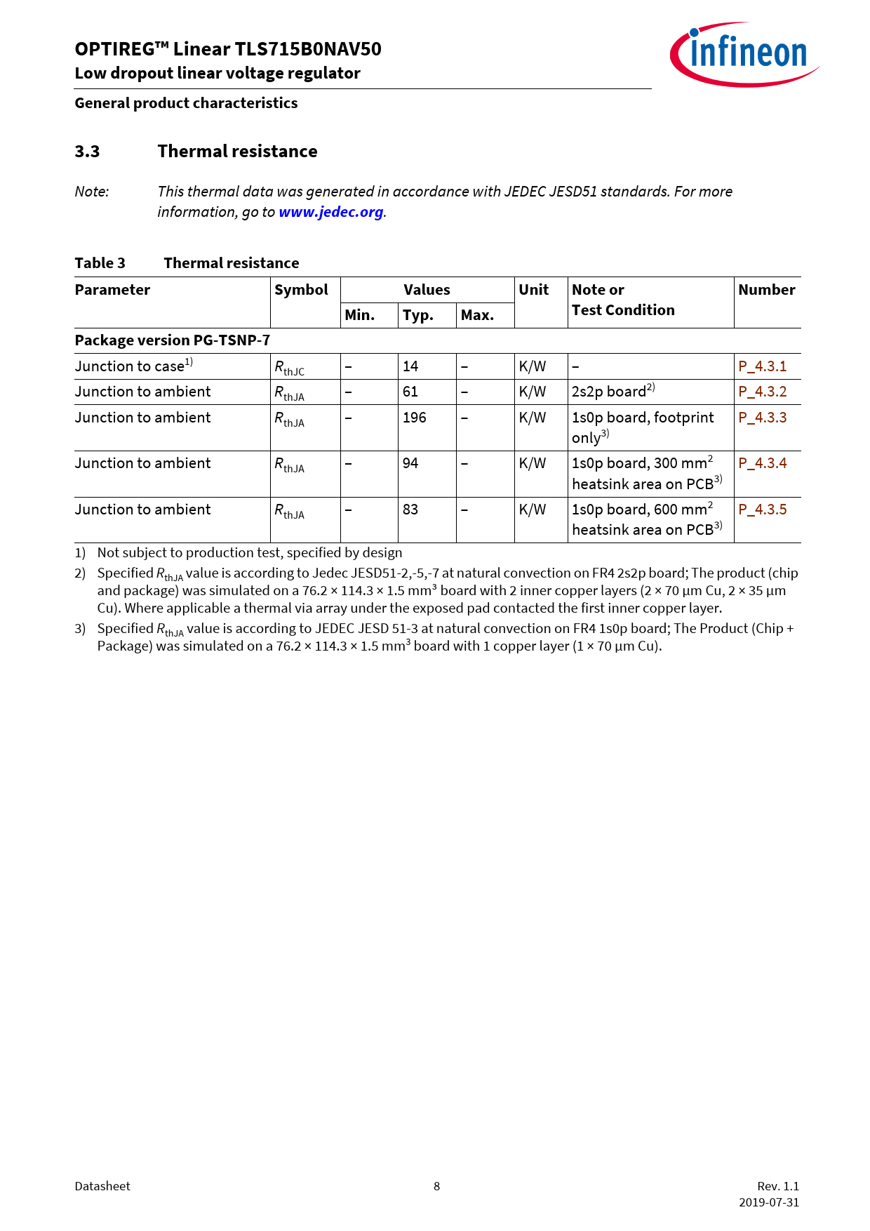 OPTIREG™ Linear TLS715B0NAV50 Low dropout linear voltage regulator General product characteristics. 3.3. Thermal resistance