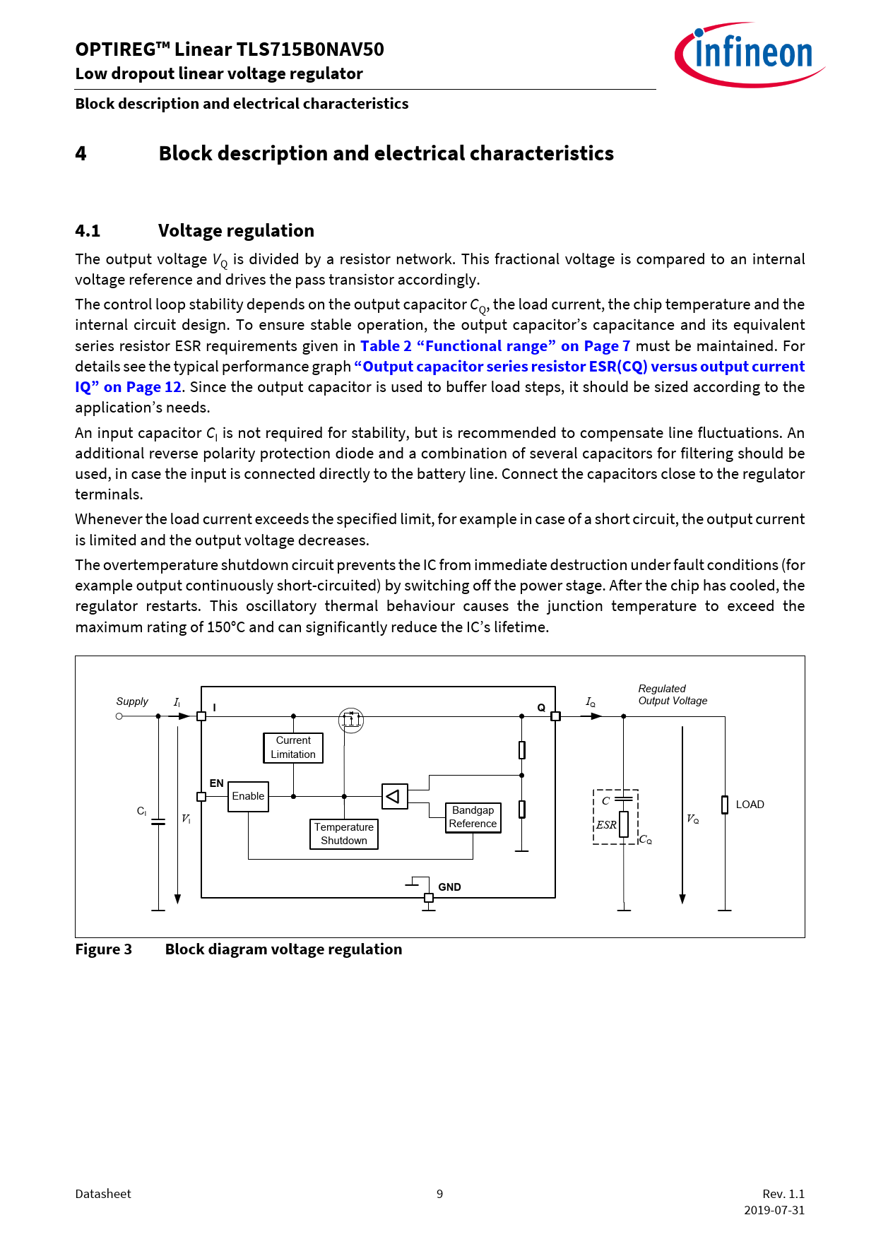 OPTIREG™ Linear TLS715B0NAV50 Low dropout linear voltage regulator Block description and electrical characteristics 4 Block description and electrical characteristics 4.1 Voltage regulation