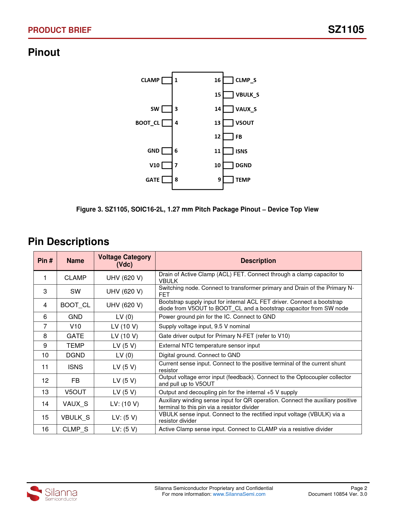 PRODUCT BRIEFSZ1105PinoutCLAMP116CLMP_S15VBULK_SSW314VAUX_SBOOT_CL413V5OUT12FBGND611ISNSV10710DGNDGATE89TEMPFigure 3. SZ1105, SOIC16-2L, 1.27 mm Pitch Package Pinout – Device Top ViewPin DescriptionsVoltage CategoryPin #NameDescription(Vdc) Drain of Active Clamp (ACL) FET. Connect through a clamp capacitor to 1 CLAMP UHV (620 V) VBULK Switching node. Connect to transformer primary and Drain of the Primary N- 3 SW UHV (620 V) FET Bootstrap supply input for internal ACL FET driver. Connect a bootstrap 4 BOOT_CL UHV (620 V) diode from V5OUT to BOOT_CL and a bootstrap capacitor from SW node 6 GND LV (0) Power ground pin for the IC. Connect to GND 7 V10 LV (10 V) Supply voltage input, 9.5 V nominal 8 GATE LV (10 V) Gate driver output for Primary N-FET (refer to V10) 9 TEMP LV (5 V) External NTC temperature sensor input 10 DGND LV (0) Digital ground. Connect to GND Current sense input. Connect to the positive terminal of the current shunt 11 ISNS LV (5 V) resistor Output voltage error input (feedback). Connect to the Optocoupler collector 12 FB LV (5 V) and pull up to V5OUT 13 V5OUT LV (5 V) Output and decoupling pin for the internal +5 V supply Auxiliary winding sense input for QR operation. Connect the auxiliary positive 14 VAUX_S LV: (10 V) terminal to this pin via a resistor divider VBULK sense input. Connect to the rectified input voltage (VBULK) via a 15 VBULK_S LV: (5 V) resistor divider 16 CLMP_S LV: (5 V) Active Clamp sense input. Connect to CLAMP via a resistive divider Silanna Semiconductor Proprietary and Confidential Page 2 For more information: www.SilannaSemi.com Document 10854 Ver. 3.0