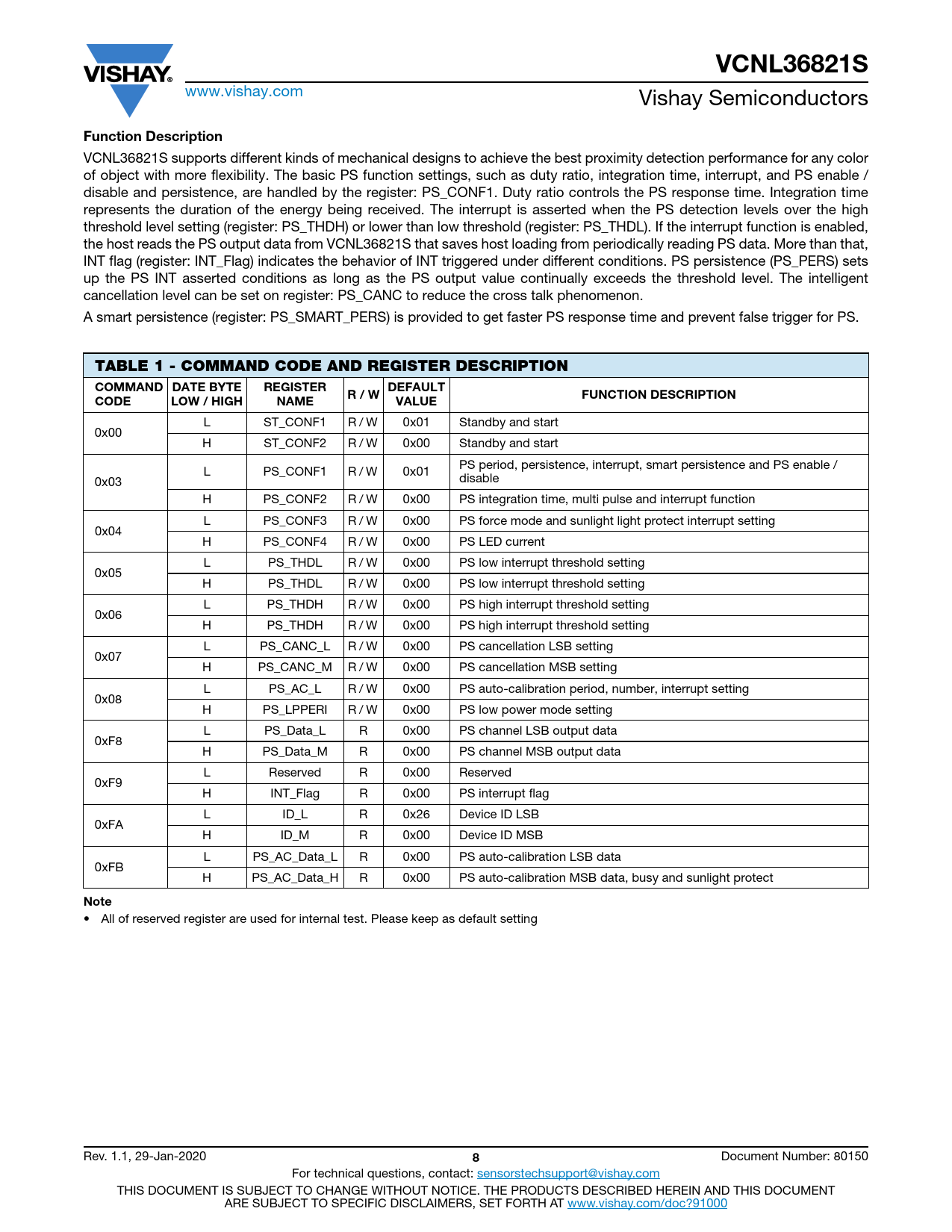 VCNL36821S. Function Description. TABLE 1 - COMMAND CODE AND REGISTER DESCRIPTION COMMAND. DATE BYTE. REGISTER. DEFAULT. R / W