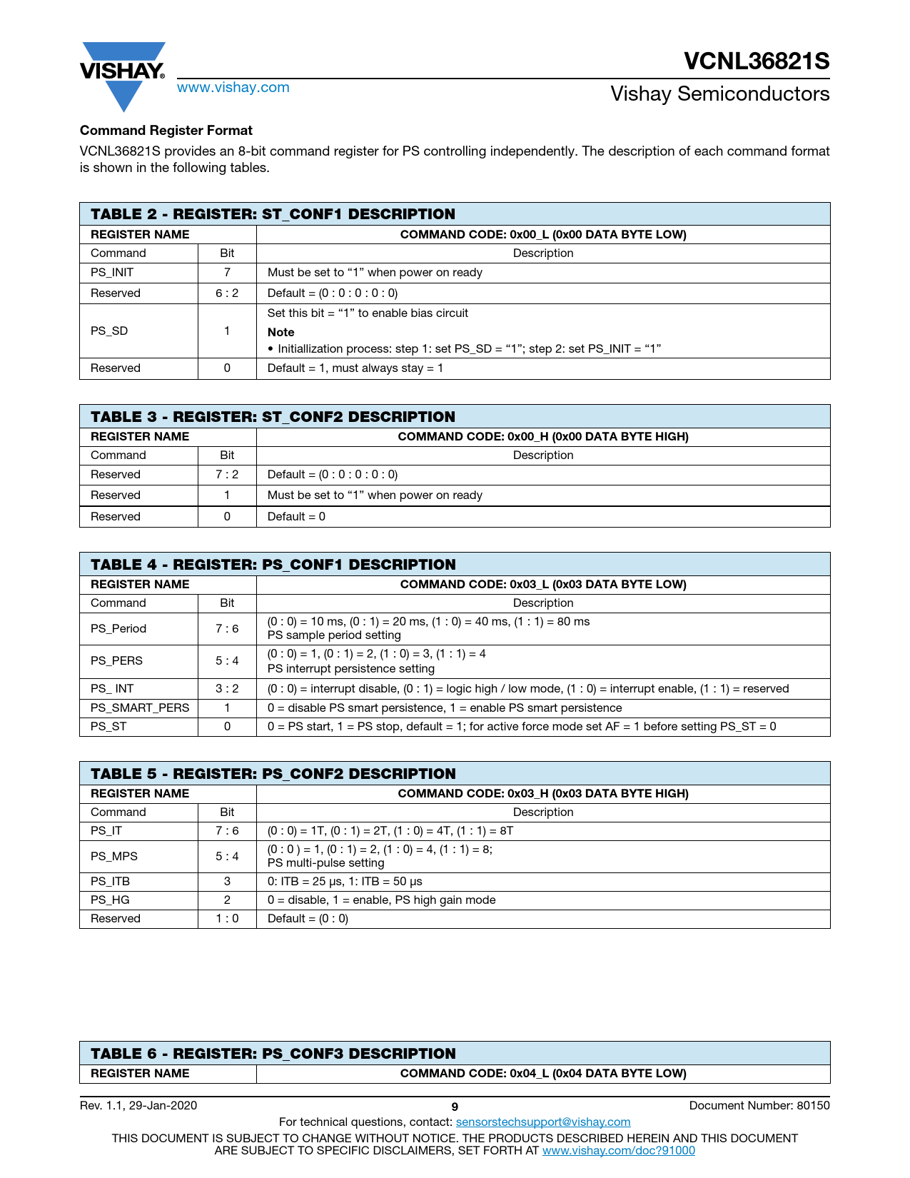 VCNL36821S. Command Register Format. TABLE 2 - REGISTER: ST_CONF1 DESCRIPTION REGISTER NAME