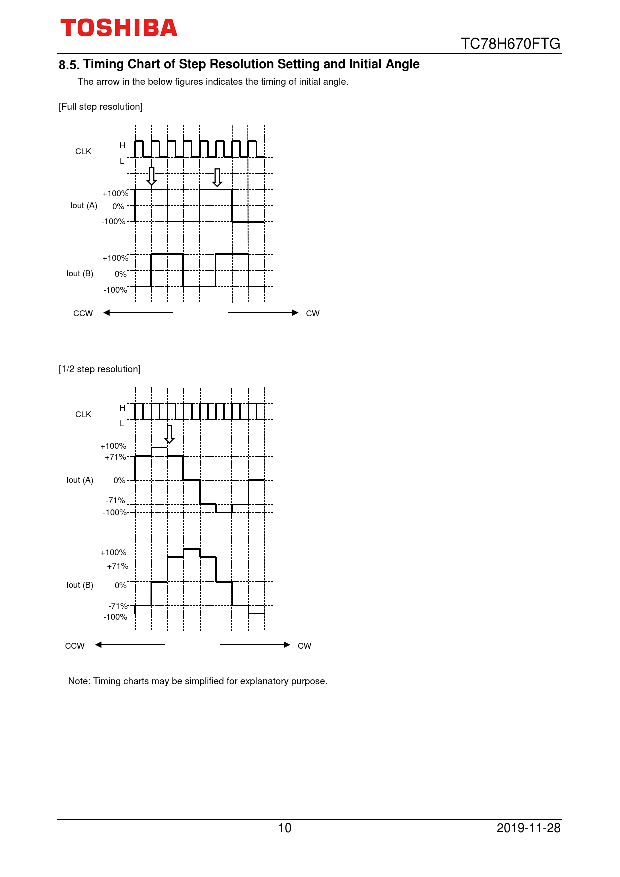 The arrow in the below figures indicates the timing of initial angle. [Full step resolution] H CLK L +100% Iout (A) 0% -100% +100% Iout (B) 0% -100% CCW CW [1/2 step resolution] H CLK L +100% +71% Iout (A) 0% -71% -100% +100% +71% Iout (B) 0% -71% -100% CCW CW Note: Timing charts may be simplified for explanatory purpose. 10 2019-11-28