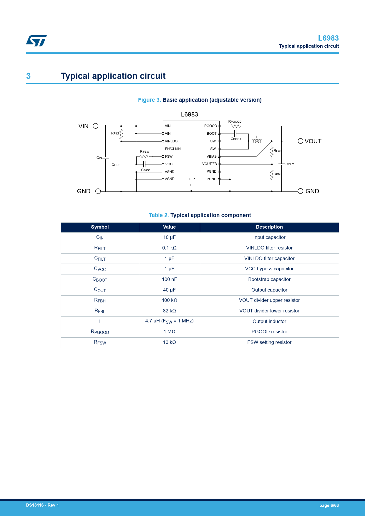 L6983. Typical application circuit. Figure 3. Basic application (adjustable version). Table 2. Typical application component