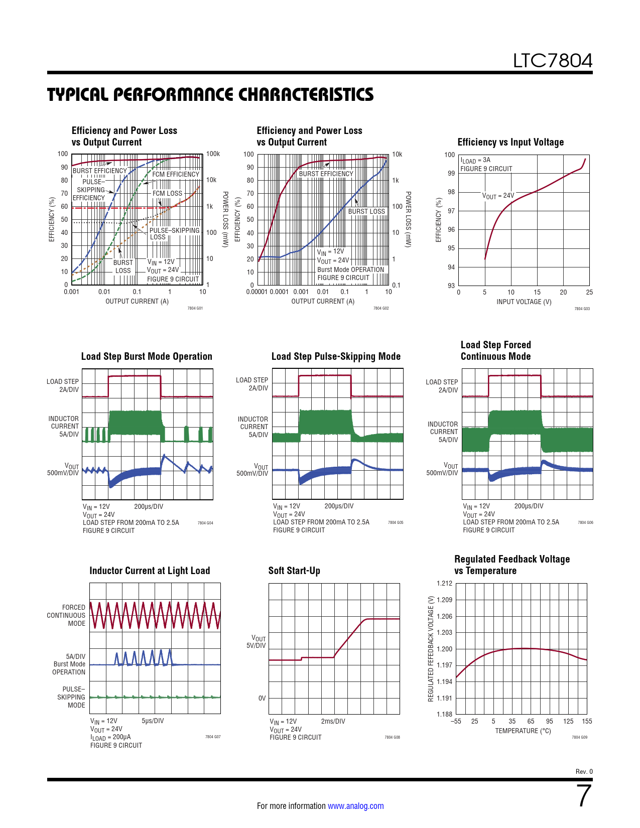 LOAD STEP LOAD STEP LOAD STEP 2A/DIV 2A/DIV 2A/DIV INDUCTOR INDUCTOR CURRENT CURRENT INDUCTOR 5A/DIV 5A/DIV CURRENT 5A/DIV VOUT VOUT VOUT 500mV/DIV 500mV/DIV 500mV/DIV VIN = 12V 200µs/DIV VIN = 12V 200µs/DIV VIN = 12V 200µs/DIV VOUT = 24V VOUT = 24V VOUT = 24V LOAD STEP FROM 200mA TO 2.5A 7804 G04 LOAD STEP FROM 200mA TO 2.5A 7804 G05 LOAD STEP FROM 200mA TO 2.5A 7804 G06 FIGURE 9 CIRCUIT FIGURE 9 CIRCUIT FIGURE 9 CIRCUIT