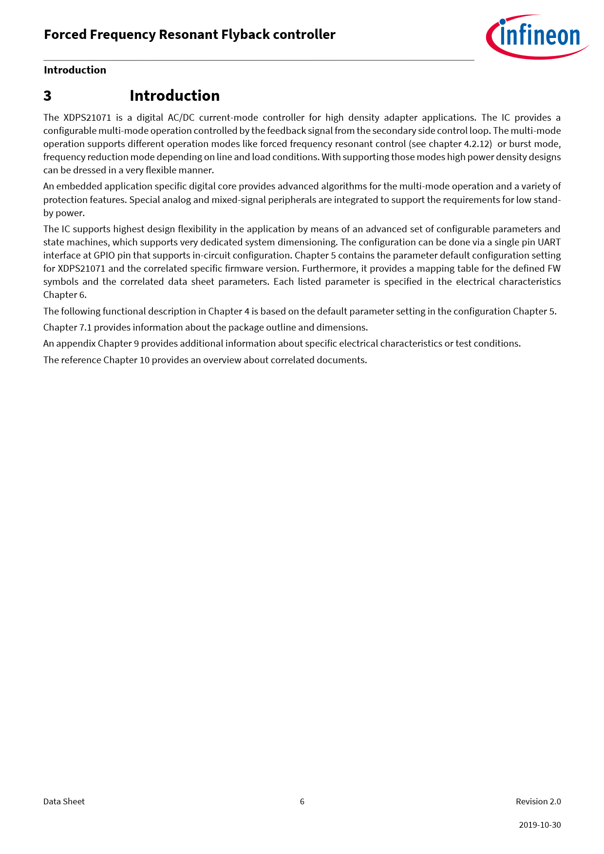 The XDPS21071 is a digital AC/DC current-mode controller for high density adapter applications. The IC provides a configurable multi-mode operation controlled by the feedback signal from the secondary side control loop. The multi-mode operation supports different operation modes like forced frequency resonant control (see chapter 4.2.12) or burst mode, frequency reduction mode depending on line and load conditions. With supporting those modes high power density designs can be dressed in a very flexible manner. An embedded application specific digital core provides advanced algorithms for the multi-mode operation and a variety of protection features. Special analog and mixed-signal peripherals are integrated to support the requirements for low stand- by power. The IC supports highest design flexibility in the application by means of an advanced set of configurable parameters and state machines, which supports very dedicated system dimensioning. The configuration can be done via a single pin UART interface at GPIO pin that supports in-circuit configuration. Chapter 5 contains the parameter default configuration setting for XDPS21071 and the correlated specific firmware version. Furthermore, it provides a mapping table for the defined FW symbols and the correlated data sheet parameters. Each listed parameter is specified in the electrical characteristics Chapter 6. The following functional description in Chapter 4 is based on the default parameter setting in the configuration Chapter 5. Chapter 7.1 provides information about the package outline and dimensions. An appendix Chapter 9 provides additional information about specific electrical characteristics or test conditions. The reference Chapter 10 provides an overview about correlated documents. Data Sheet 6 Revision 2.0 2019-10-30