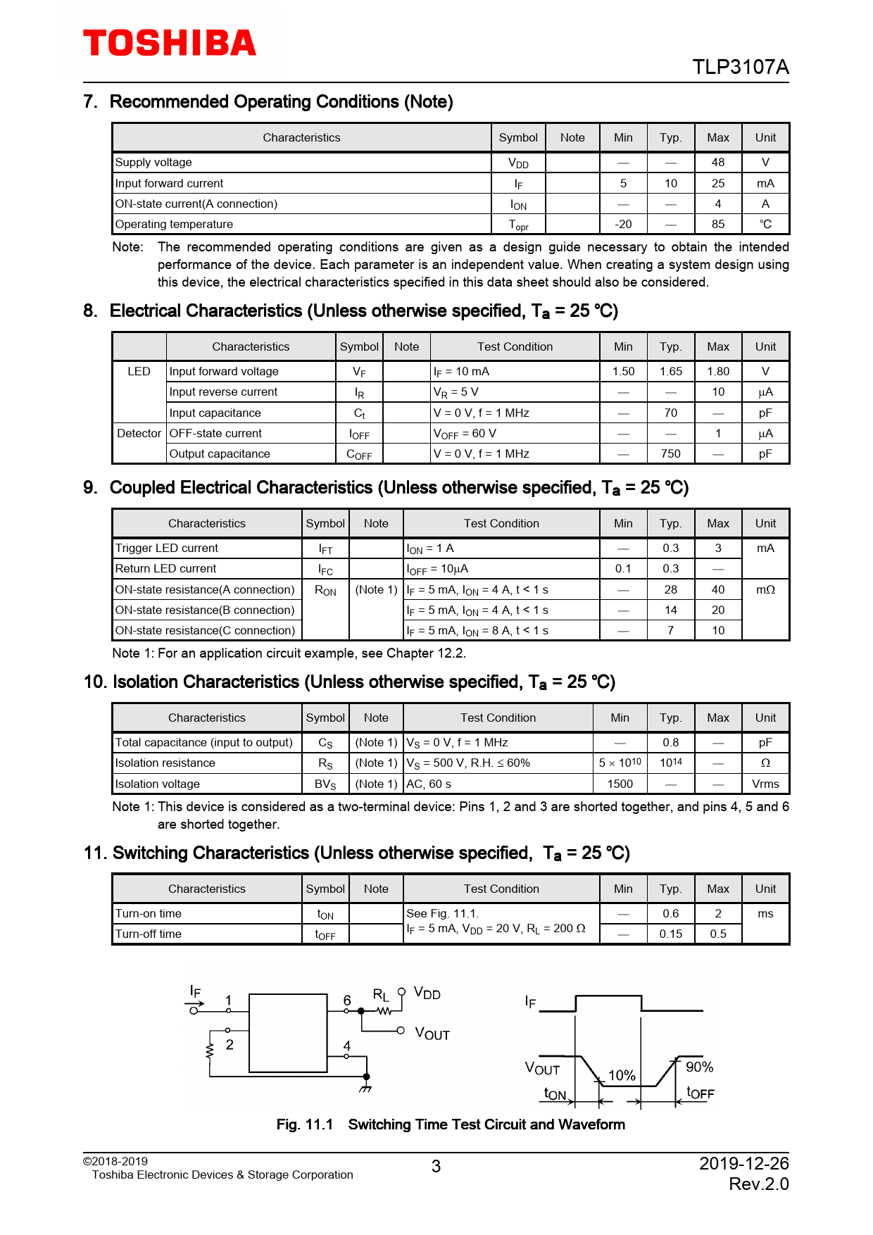 TLP3107A 7. Recommended Operating Conditions (Note) Characteristics Symbol Note Min Typ. Max Unit Supply voltage VDD 48 V Input forward current IF 5 10 25 mA ON-state current(A connection) ION 4 A Operating temperature Topr -20 85 Note: The recommended operating conditions are given as a design guide necessary to obtain the intended performance of the device. Each parameter is an independent value. When creating a system design using this device, the electrical characteristics specified in this data sheet should also be considered. 8. Electrical Characteristics (Unless otherwise specified, Ta = 25 ) Characteristics Symbol Note Test Condition Min Typ. Max Unit LED Input forward voltage VF IF = 10 mA 1.50 1.65 1.80 V Input reverse current IR VR = 5 V 10 µA Input capacitance Ct V = 0 V, f = 1 MHz 70 pF Detector OFF-state current IOFF VOFF = 60 V 1 µA Output capacitance COFF V = 0 V, f = 1 MHz 750 pF 9. Coupled Electrical Characteristics (Unless otherwise specified, Ta = 25 ) Characteristics Symbol Note Test Condition Min Typ. Max Unit Trigger LED current IFT ION = 1 A 0.3 3 mA Return LED current IFC IOFF = 10µA 0.1 0.3 ON-state resistance(A connection) RON (Note 1) IF = 5 mA, ION = 4 A, t < 1 s 28 40 mΩ ON-state resistance(B connection) IF = 5 mA, ION = 4 A, t < 1 s 14 20 ON-state resistance(C connection) IF = 5 mA, ION = 8 A, t < 1 s 7 10 Note 1: For an application circuit example, see Chapter 12.2. 10. Isolation Characteristics (Unless otherwise specified, Ta = 25 ) Characteristics Symbol Note Test Condition Min Typ. Max Unit Total capacitance (input to output) CS (Note 1) VS = 0 V, f = 1 MHz 0.8 pF Isolation resistance RS (Note 1) VS = 500 V, R.H. ≤ 60% 5 × 1010 1014 Ω Isolation voltage BVS (Note 1) AC, 60 s 1500 Vrms Note 1: This device is considered as a two-terminal device: Pins 1, 2 and 3 are shorted together, and pins 4, 5 and 6 are shorted together. 11. Switching Characteristics (Unless otherwise specified, Ta = 25 ) Characteristics Symbol Note Test Condition Min Typ. Max Unit Turn-on time tON See Fig. 11.1. 0.6 2 ms Turn-off time t IF = 5 mA, VDD = 20 V, RL = 200 Ω OFF 0.15 0.5 Fig. 11.1 Switching Time Test Circuit and Waveform ©2018-2019 3 2019-12-26 Toshiba Electronic Devices & Storage Corporation Rev.2.0