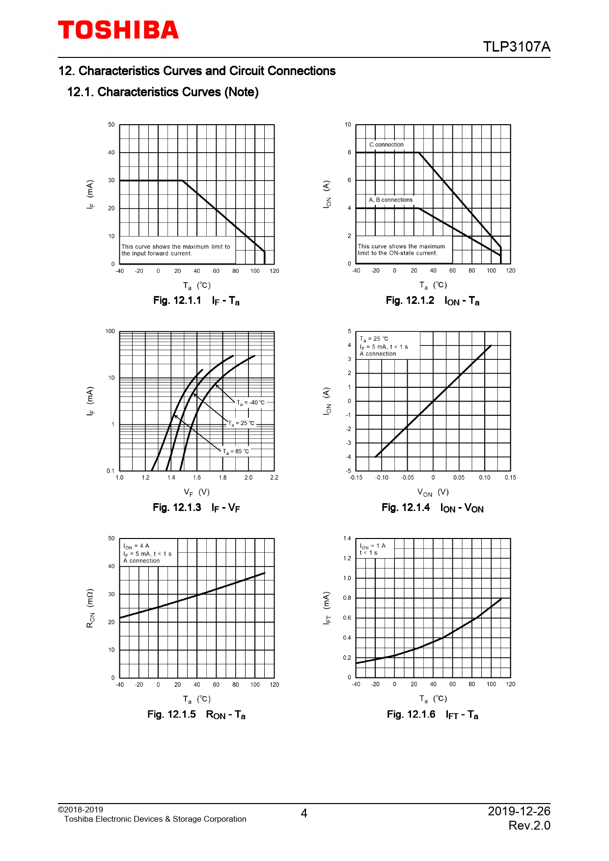 TLP3107A. 12. Characteristics. Curves. and. Circuit. Connections. 12.1. Characteristics. Curves. (Note). Fig. 12.1.1. IF. -. Ta. Fig. 12.1.2. ION. -. Ta. Fig