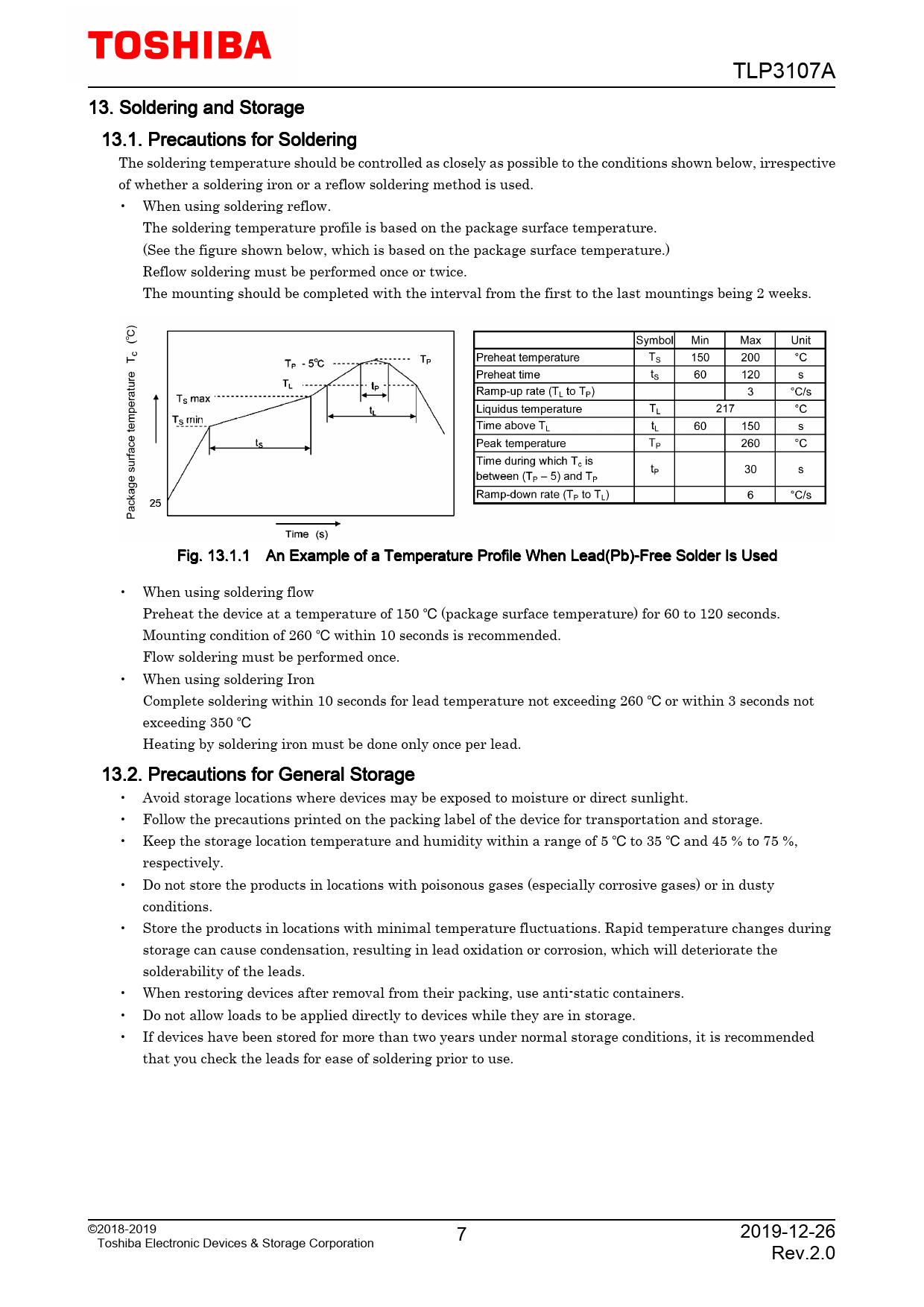 TLP3107A. 13. Soldering. and. Storage. 13.1. Precautions. for. Soldering. The. soldering. temperature. should. be. controlled. as. closely. as. possible. to