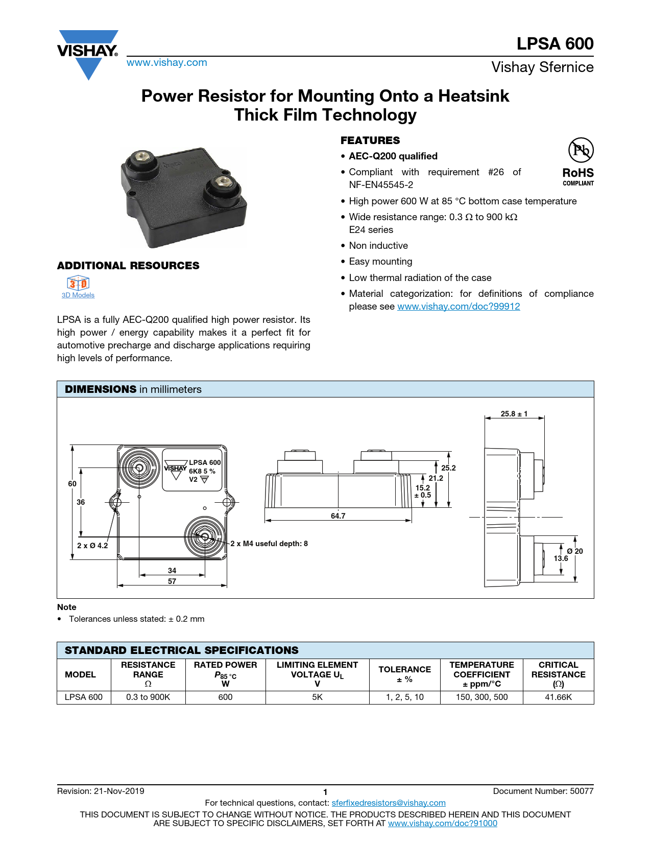 LPSA 600. Power Resistor for Mounting Onto a Heatsink. Thick Film Technology. FEATURES. AEC-Q200 qualified. ADDITIONAL RESOURCES