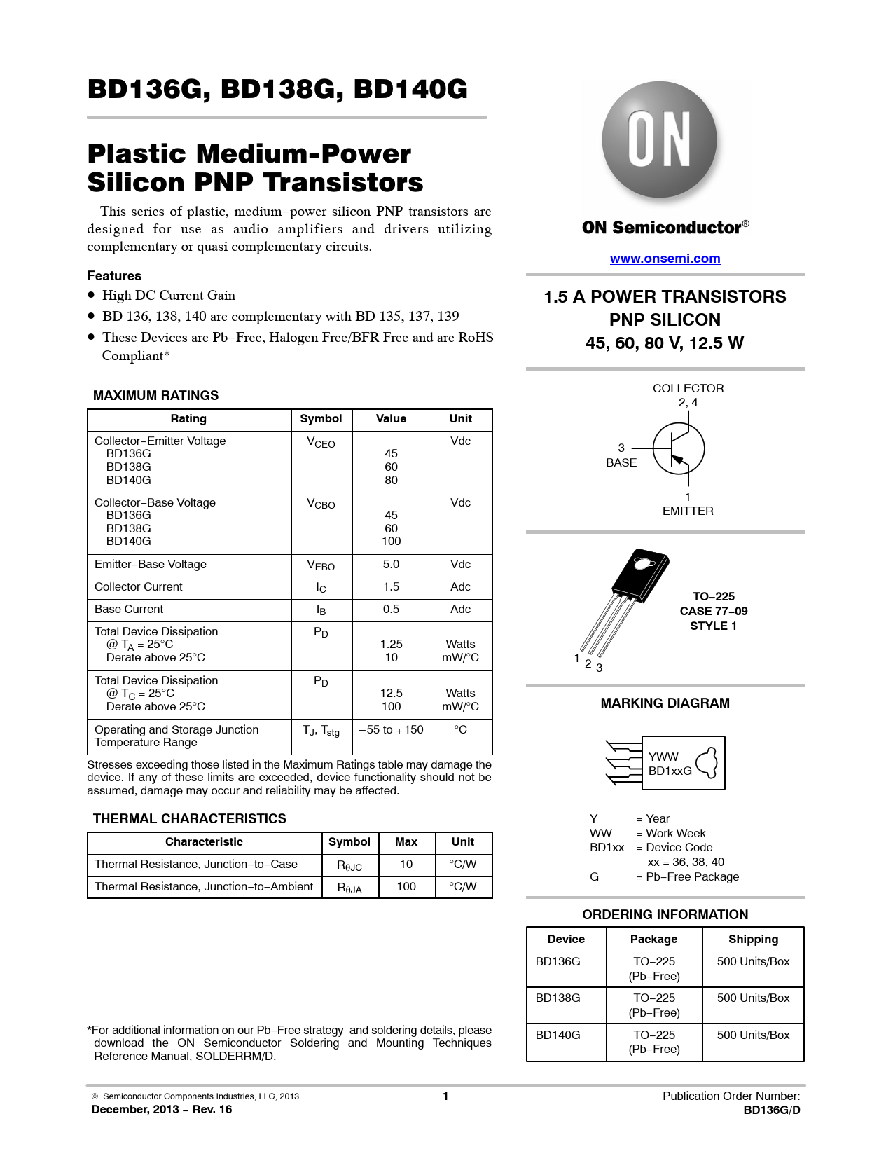 BD136G, BD138G, BD140G Plastic Medium-Power Silicon PNP Transistors This series of plastic, medium−power silicon PNP transistors are designed for use as audio amplifiers and drivers utilizing complementary or quasi complementary circuits.