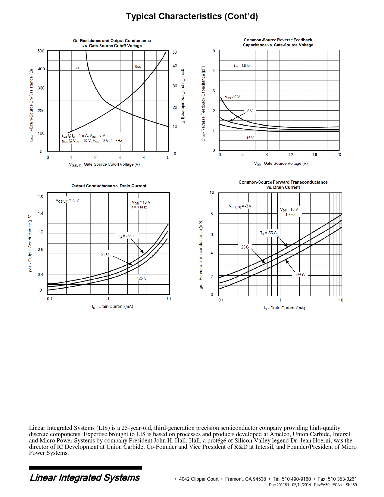 Linear Integrated Systems (LIS) is a 25-year-old, third-generation precision semiconductor company providing high-quality discrete components. Expertise brought to LIS is based on processes and products developed at Amelco, Union Carbide, Intersil and Micro Power Systems by company President John H. Hall. Hall, a protégé of Silicon Valley legend Dr. Jean Hoerni, was the director of IC Development at Union Carbide, Co-Founder and Vice President of R&D at Intersil, and Founder/President of Micro Power Systems. Linear Integrated Systems • 4042 Clipper Court • Fremont, CA 94538 • Tel: 510 490-9160 • Fax: 510 353-0261 Doc 201151 05/14/2014 Rev#A30 ECN# LSK489