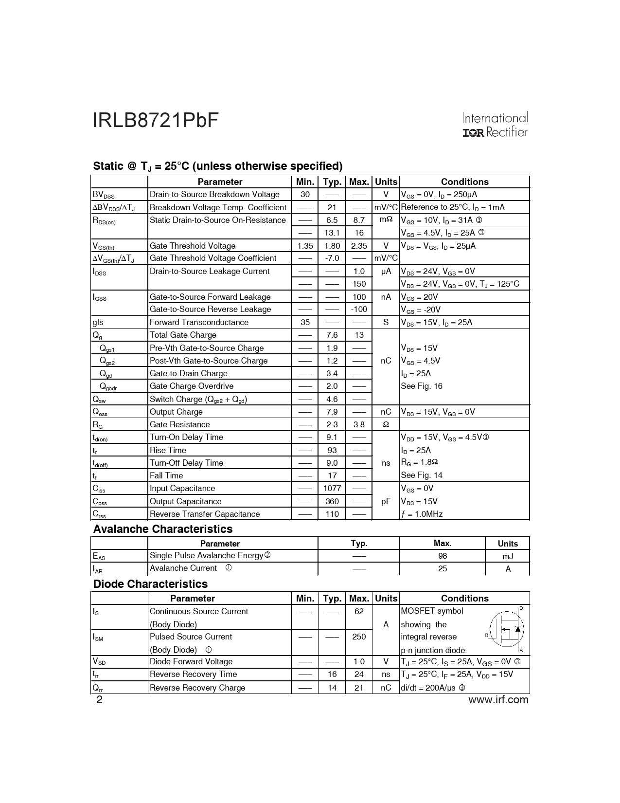 BVDSS Drain-to-Source Breakdown Voltage 30 ––– ––– V VGS = 0V, ID = 250μA ΔΒVDSS/ΔTJ Breakdown Voltage Temp. Coefficient ––– 21 ––– mV/°C Reference to 25°C, ID = 1mA RDS(on) Static Drain-to-Source On-Resistance ––– 6.5 8.7 mΩ VGS = 10V, ID = 31A e ––– 13.1 16 VGS = 4.5V, ID = 25A e VGS(th) Gate Threshold Voltage 1.35 1.80 2.35 V VDS = VGS, ID = 25μA ΔVGS(th)/ΔTJ Gate Threshold Voltage Coefficient ––– -7.0 ––– mV/°C IDSS Drain-to-Source Leakage Current ––– ––– 1.0 μA VDS = 24V, VGS = 0V ––– ––– 150 VDS = 24V, VGS = 0V, TJ = 125°C IGSS Gate-to-Source Forward Leakage ––– ––– 100 nA VGS = 20V Gate-to-Source Reverse Leakage ––– ––– -100 VGS = -20V gfs Forward Transconductance 35 ––– ––– S VDS = 15V, ID = 25A Qg Total Gate Charge ––– 7.6 13 Qgs1 Pre-Vth Gate-to-Source Charge ––– 1.9 ––– VDS = 15V Qgs2 Post-Vth Gate-to-Source Charge ––– 1.2 ––– nC VGS = 4.5V Qgd Gate-to-Drain Charge ––– 3.4 ––– ID = 25A Qgodr Gate Charge Overdrive ––– 2.0 ––– See Fig. 16 Qsw Switch Charge (Qgs2 + Qgd) ––– 4.6 ––– Qoss Output Charge ––– 7.9 ––– nC VDS = 15V, VGS = 0V RG Gate Resistance ––– 2.3 3.8 Ω td(on) Turn-On Delay Time ––– 9.1 ––– VDD = 15V, VGS = 4.5Ve tr Rise Time ––– 93 ––– ID = 25A t R d(off) Turn-Off Delay Time ––– 9.0 ––– ns G = 1.8Ω tf Fall Time ––– 17 ––– See Fig. 14 Ciss Input Capacitance ––– 1077 ––– VGS = 0V Coss Output Capacitance ––– 360 ––– pF VDS = 15V Crss Reverse Transfer Capacitance ––– 110 ––– ƒ = 1.0MHz