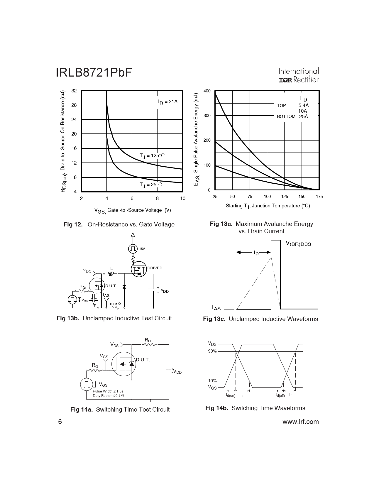 IRLB8721PbF ) 32 Ω 400 ) m( J I e m( D c I 28 D = 31A n y TOP 5.4A a g t r s 10A i e s n 300 BOTTOM 25A e 24 E R e n hc O n 20 e al cr a u v 200 o A S 16 e - sl ot u - T P n J = 125°C i e a 12 l r g 100 D n i , ) S n , 8 o S ( A S E D TJ = 25°C R 4 0 2 4 6 8 10 25 50 75 100 125 150 175 Starting T V J, Junction Temperature (°C) GS, Gate -to -Source Voltage (V) Fig 12. On-Resistance vs. Gate Voltage Fig 13a. Maximum Avalanche Energy vs. Drain Current V(BR)DSS 15V tp L DRIVER VDS RG D.U.T + - VDD IAS A 20V VGS t 0.01 p Ω IAS Fig 13b. Unclamped Inductive Test Circuit Fig 13c. Unclamped Inductive Waveforms RD V V DS DS 90% VGS D.U.T. RG +-VDD 10% VGS VGS Pulse Width ≤ 1 µs t Duty Factor ≤ 0.1 % d(on) tr td(off) tf Fig 14a. Switching Time Test Circuit Fig 14b. Switching Time Waveforms 6 www.irf.com
