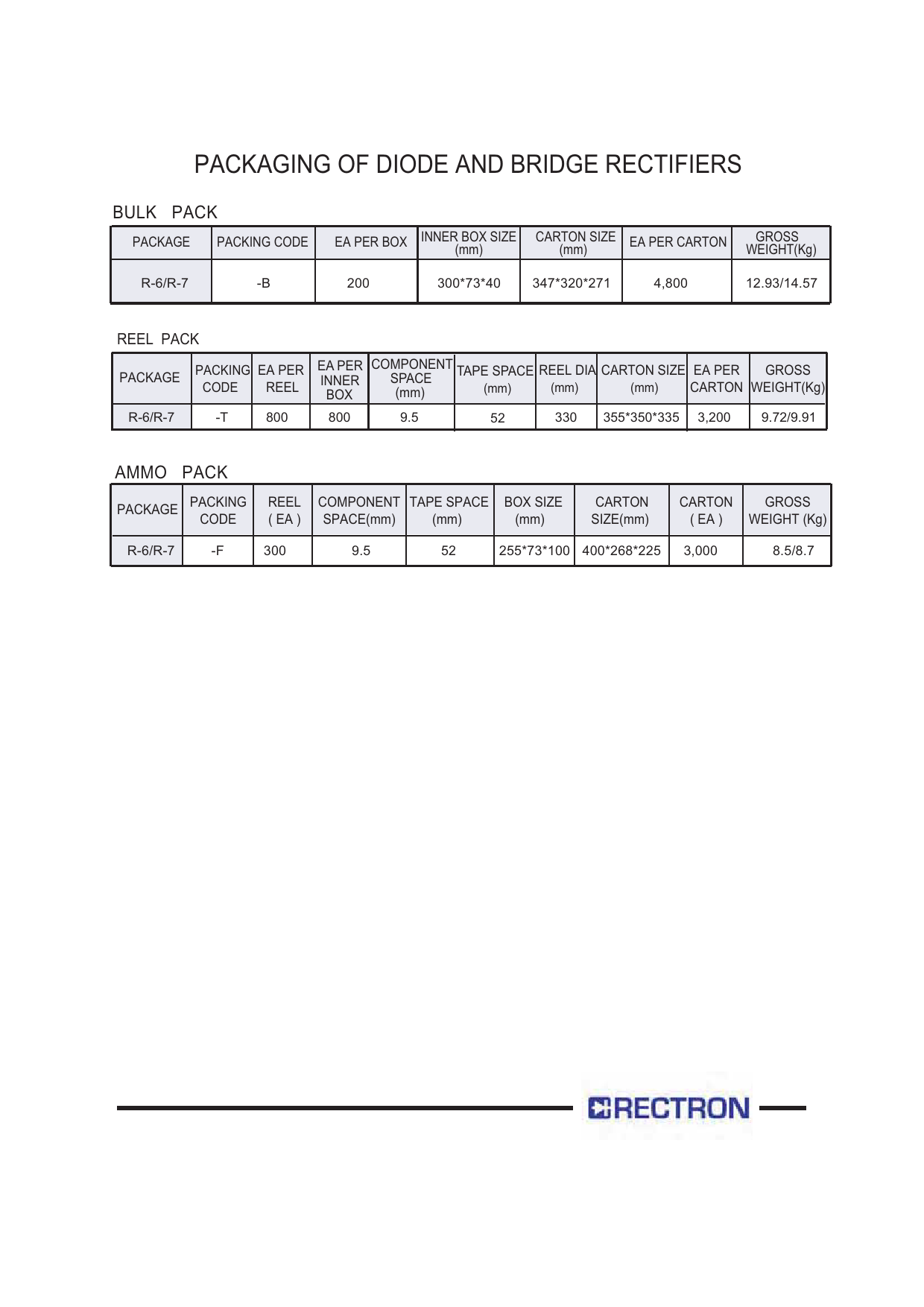 PACKAGING OF DIODE AND BRIDGE RECTIFIERS BULK PACK PACKAGE PACKING CODE EA PER BOX INNER BOX SIZE CARTON SIZE EA PER CARTON GROSS (mm) (mm) WEIGHT(Kg) R-6/R-7 -B 200 300*73*40 347*320*271 4,800 12.93/14.57 REEL PACK PACKING EA PER EA PER COMPONENT TAPE SPACE REEL DIA CARTON SIZE EA PER GROSS PACKAGE INNER SPACE CODE REEL (mm) (mm) (mm) CARTON WEIGHT(Kg) BOX (mm) R-6/R-7 -T 800 800 9.5 52 330 355*350*335 3,200 9.72/9.91 AMMO PACK PACKING REEL COMPONENT TAPE SPACE BOX SIZE CARTON CARTON GROSS PACKAGE CODE ( EA ) SPACE(mm) (mm) (mm) SIZE(mm) ( EA ) WEIGHT (Kg) R-6/R-7 -F 300 9.5 52 255*73*100 400*268*225 3,000 8.5/8.7