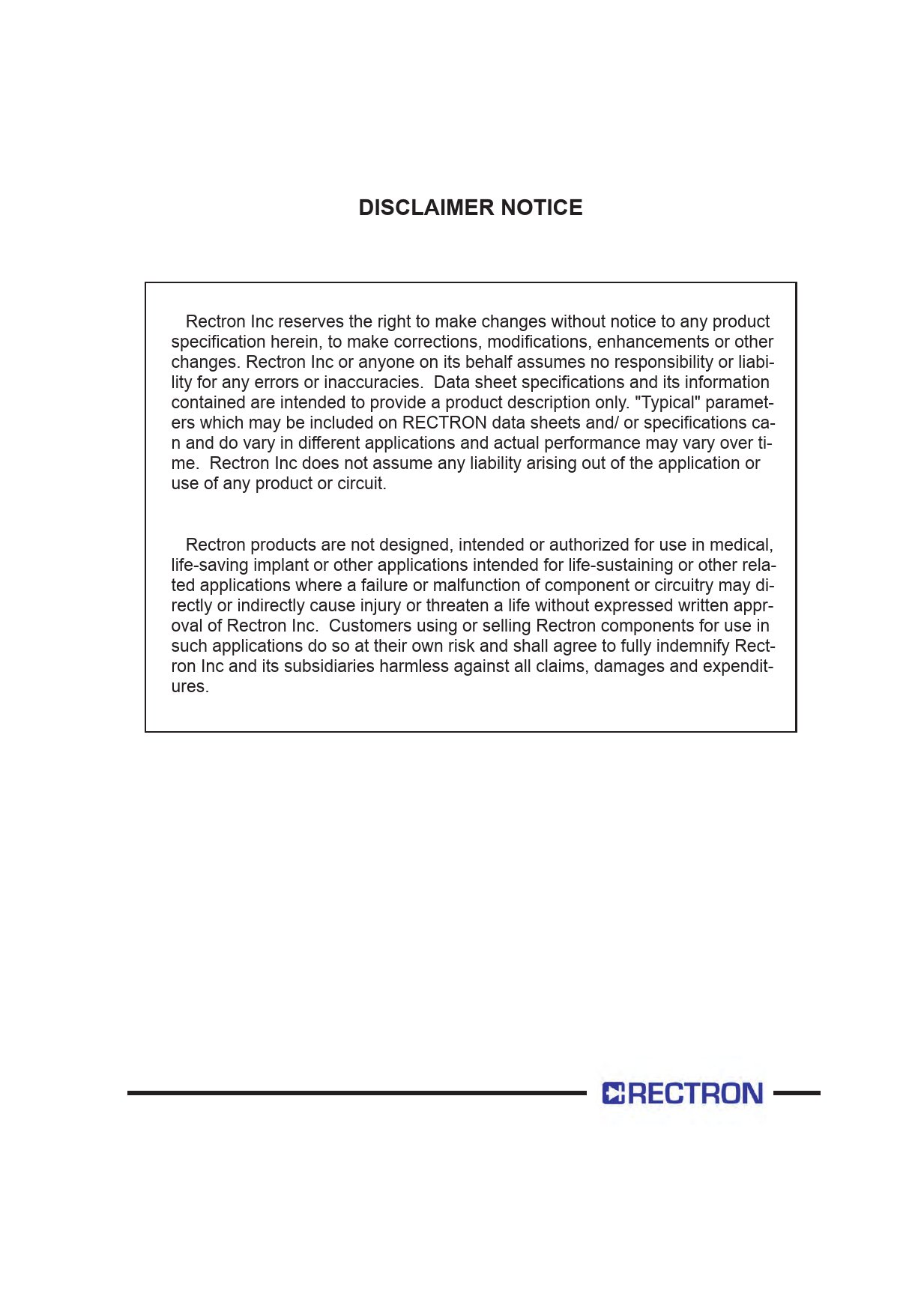 Rectron Inc reserves the right to make changes without notice to any product specification herein, to make corrections, modifications, enhancements or other changes. Rectron Inc or anyone on its behalf assumes no responsibility or liabi- lity for any errors or inaccuracies. Data sheet specifications and its information contained are intended to provide a product description only. "Typical" paramet- ers which may be included on RECTRON data sheets and/ or specifications ca- n and do vary in dif erent applications and actual performance may vary over ti- me. Rectron Inc does not assume any liability arising out of the application or use of any product or circuit. Rectron products are not designed, intended or authorized for use in medical, life-saving implant or other applications intended for life-sustaining or other rela- ted applications where a failure or malfunction of component or circuitry may di- rectly or indirectly cause injury or threaten a life without expressed written appr- oval of Rectron Inc. Customers using or sel ing Rectron components for use in such applications do so at their own risk and shal agree to ful y indemnify Rect- ron Inc and its subsidiaries harmless against al claims, damages and expendit- ures.