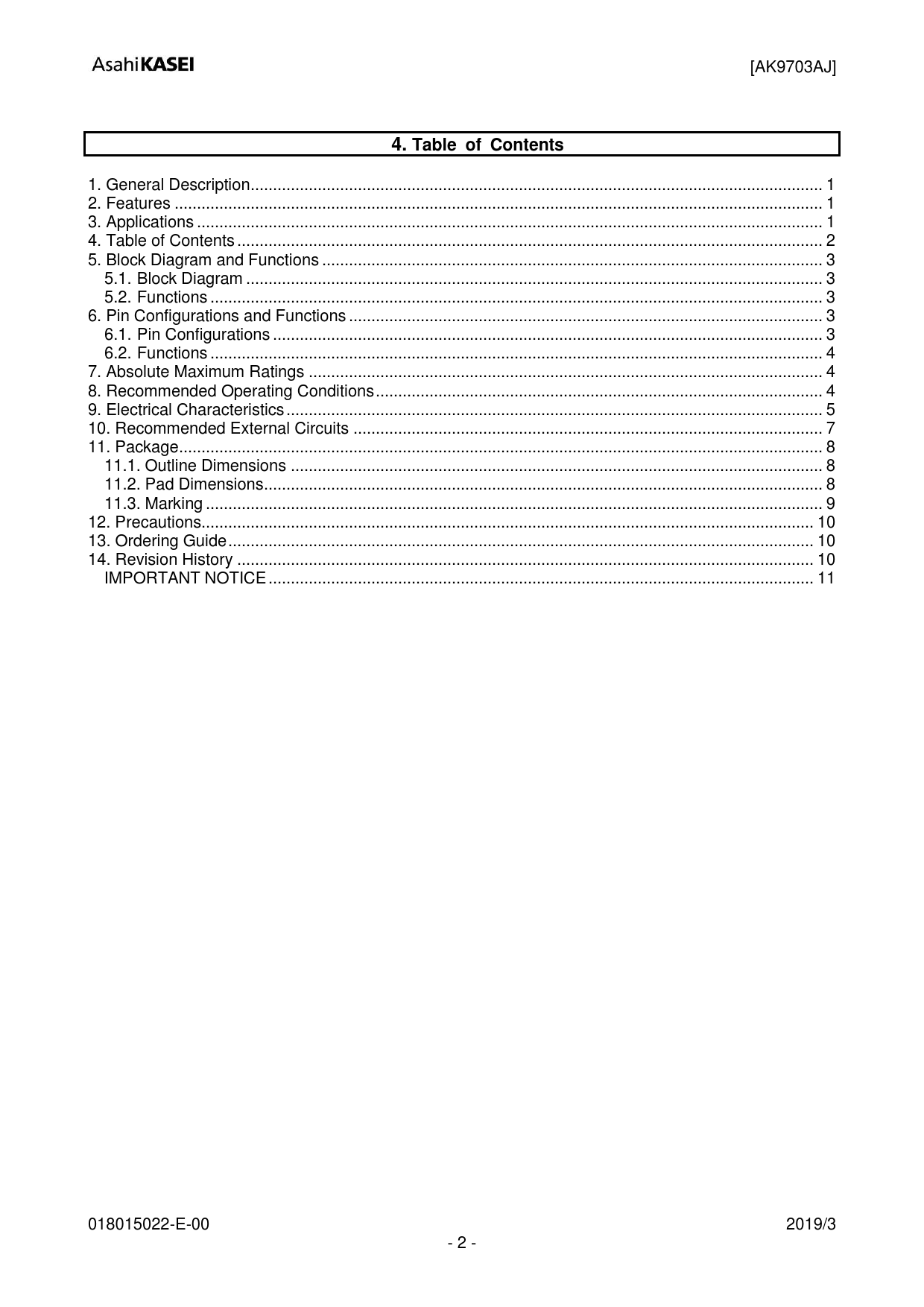 link to page 1 link to page 1 link to page 1 link to page 2 link to page 3 link to page 3 link to page 3 link to page 3 link to page 3 link to page 4 link to page 4 link to page 4 link to page 5 link to page 7 link to page 8 link to page 8 link to page 8 link to page 9 link to page 10 link to page 10 link to page 10 link to page 11 [AK9703AJ] 4. Table of Contents 1. General Description .. 1 2. Features ... 1 3. Applications .. 1 4. Table of Contents ... 2 5. Block Diagram and Functions .. 3 5.1. Block Diagram ... 3 5.2. Functions ... 3 6. Pin Configurations and Functions .. 3 6.1. Pin Configurations ... 3 6.2. Functions ... 4 7. Absolute Maximum Ratings ... 4 8. Recommended Operating Conditions .. 4 9. Electrical Characteristics .. 5 10. Recommended External Circuits ... 7 11. Package .. 8 11.1. Outline Dimensions ... 8 11.2. Pad Dimensions ... 8 11.3. Marking .. 9 12. Precautions... 10 13. Ordering Guide ... 10 14. Revision History ... 10 IMPORTANT NOTICE .. 11 018015022-E-00 2019/3 - 2 -