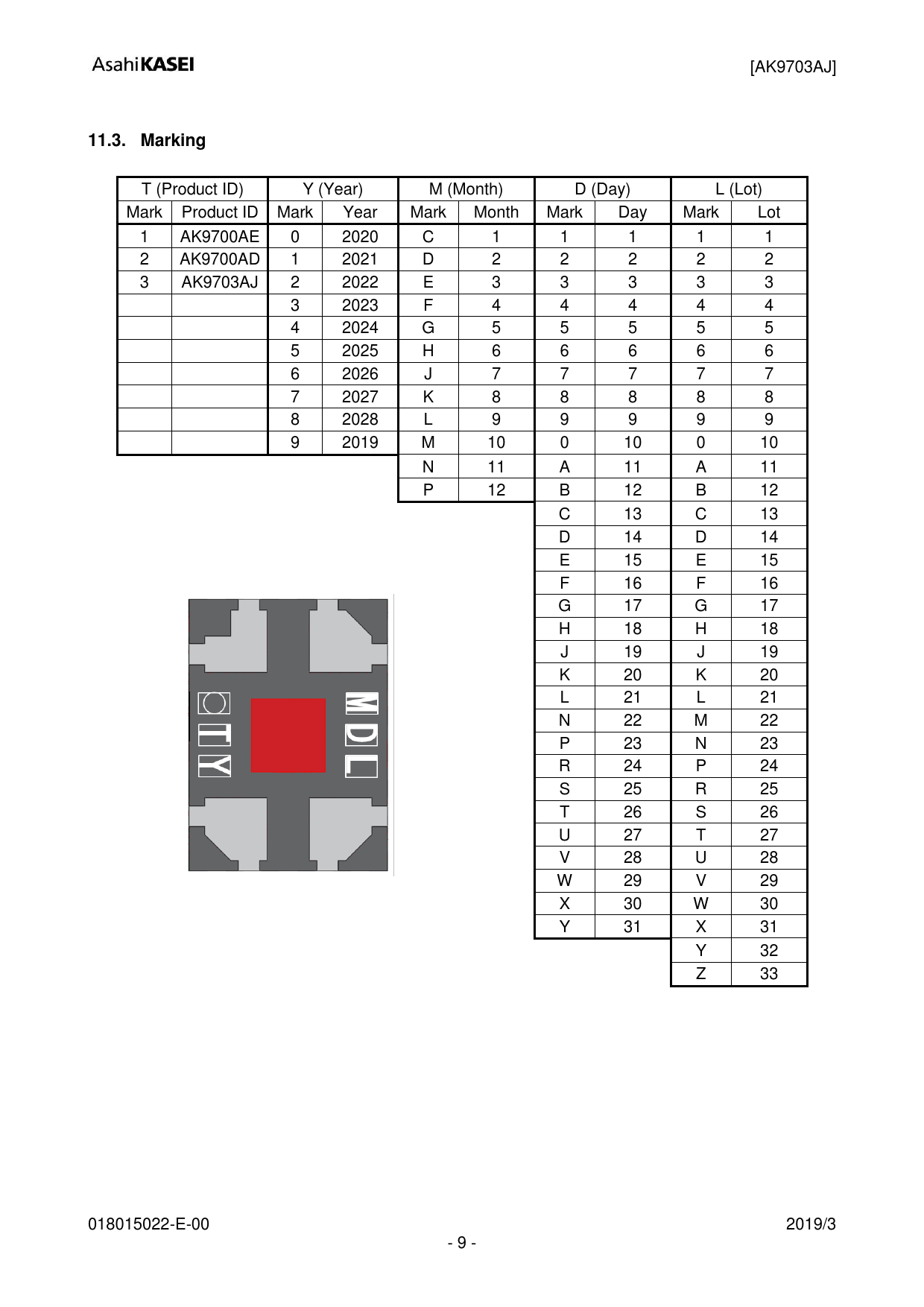 T (Product ID) Y (Year) M (Month) D (Day) L (Lot) Mark Product ID Mark Year Mark Month Mark Day Mark Lot 1 AK9700AE 0 2020 C 1 1 1 1 1 2 AK9700AD 1 2021 D 2 2 2 2 2 3 AK9703AJ 2 2022 E 3 3 3 3 3 3 2023 F 4 4 4 4 4 4 2024 G 5 5 5 5 5 5 2025 H 6 6 6 6 6 6 2026 J 7 7 7 7 7 7 2027 K 8 8 8 8 8 8 2028 L 9 9 9 9 9 9 2019 M 10 0 10 0 10 N 11 A 11 A 11 P 12 B 12 B 12 C 13 C 13 D 14 D 14 E 15 E 15 F 16 F 16 G 17 G 17 H 18 H 18 J 19 J 19 K 20 K 20 L 21 L 21 N 22 M 22 P 23 N 23 R 24 P 24 S 25 R 25 T 26 S 26 U 27 T 27 V 28 U 28 W 29 V 29 X 30 W 30 Y 31 X 31 Y 32 Z 33 018015022-E-00 2019/3 - 9 -