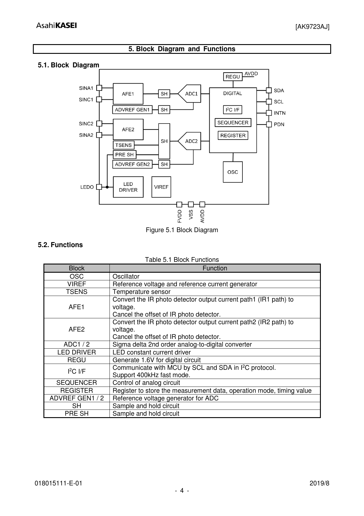 Table 5.1 Block Functions Block Function OSC Oscillator VIREF Reference voltage and reference current generator TSENS Temperature sensor Convert the IR photo detector output current path1 (IR1 path) to AFE1 voltage. Cancel the offset of IR photo detector. Convert the IR photo detector output current path2 (IR2 path) to AFE2 voltage. Cancel the offset of IR photo detector. ADC1 / 2 Sigma delta 2nd order analog-to-digital converter LED DRIVER LED constant current driver REGU Generate 1.6V for digital circuit Communicate with MCU by SCL and SDA in I2C protocol. I2C I/F Support 400kHz fast mode. SEQUENCER Control of analog circuit REGISTER Register to store the measurement data, operation mode, timing value ADVREF GEN1 / 2 Reference voltage generator for ADC SH Sample and hold circuit PRE SH Sample and hold circuit 018015111-E-01 2019/8 - 4 -