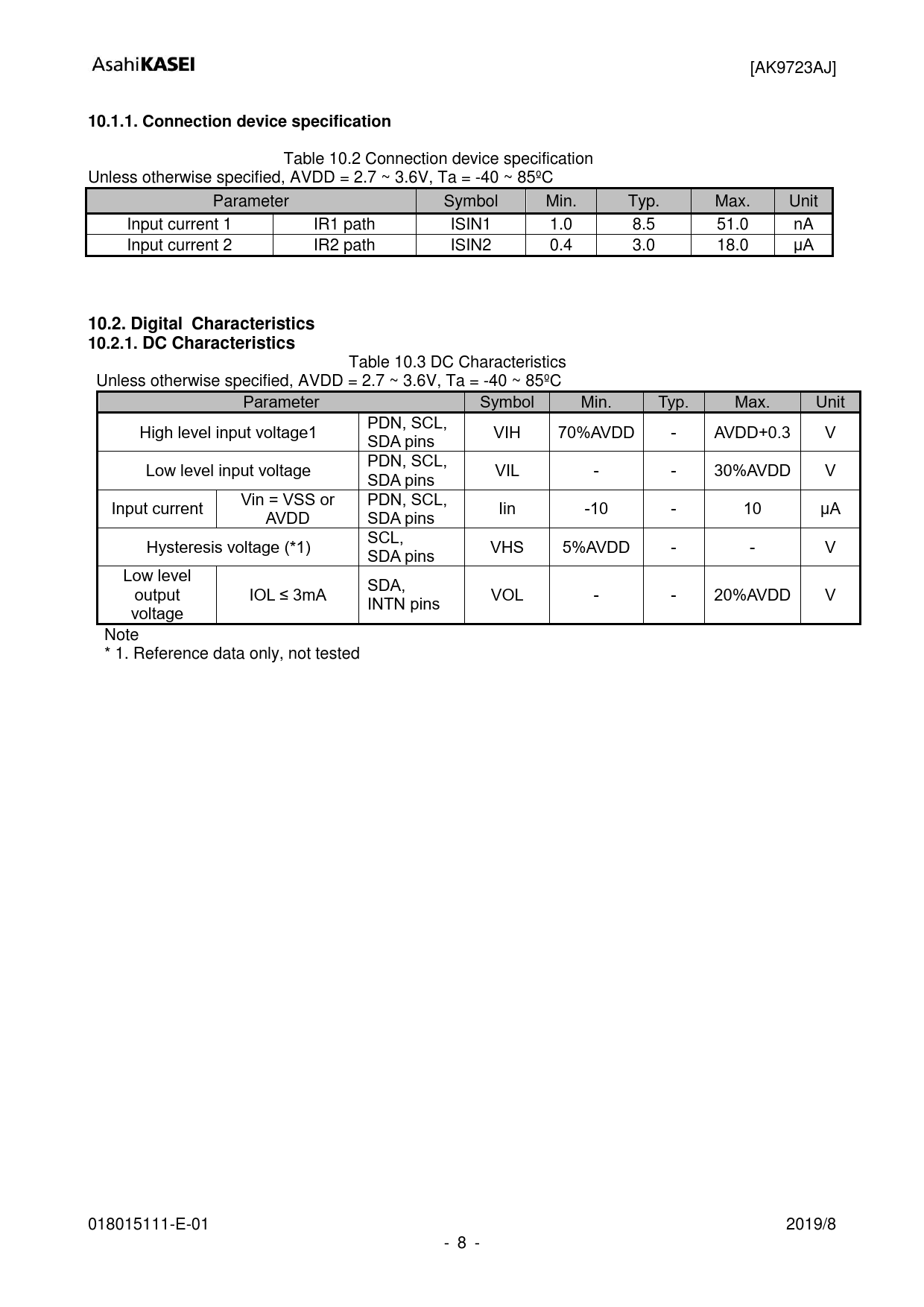 Table 10.3 DC Characteristics Unless otherwise specified, AVDD = 2.7 ~ 3.6V, Ta = -40 ~ 85ºC Parameter Symbol Min. Typ. Max. Unit PDN, SCL, High level input voltage1 VIH SDA pins 70%AVDD - AVDD+0.3 V PDN, SCL, Low level input voltage VIL SDA pins - - 30%AVDD V Vin = VSS or PDN, SCL, Input current Iin AVDD -10 - 10 μA SDA pins SCL, Hysteresis voltage (*1) VHS SDA pins 5%AVDD - - V Low level SDA, output IOL ≤ 3mA VOL INTN pins - - 20%AVDD V voltage Note * 1. Reference data only, not tested 018015111-E-01 2019/8 - 8 -