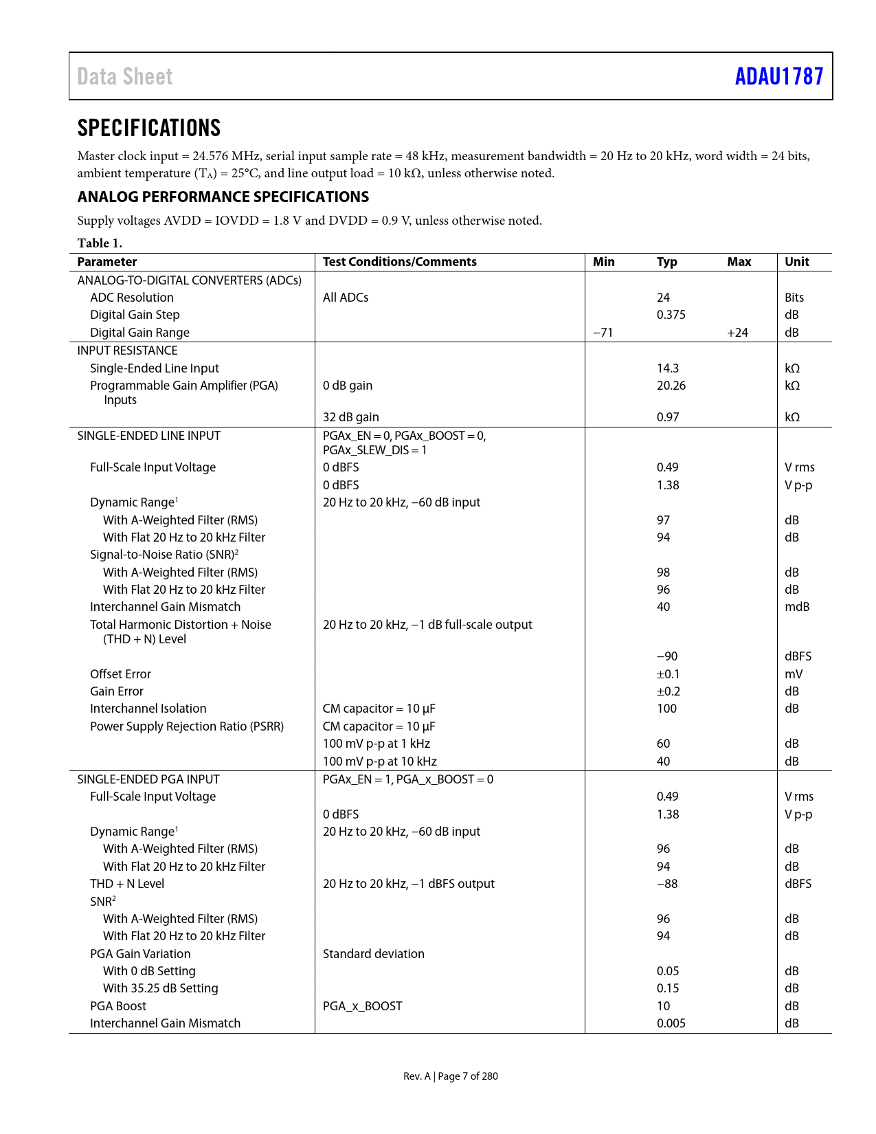Páginas / Página280 / 7 — Data Sheet. ADAU1787. SPECIFICATIONS. ANALOG PERFORMANCE SPECIFICATIONS. …