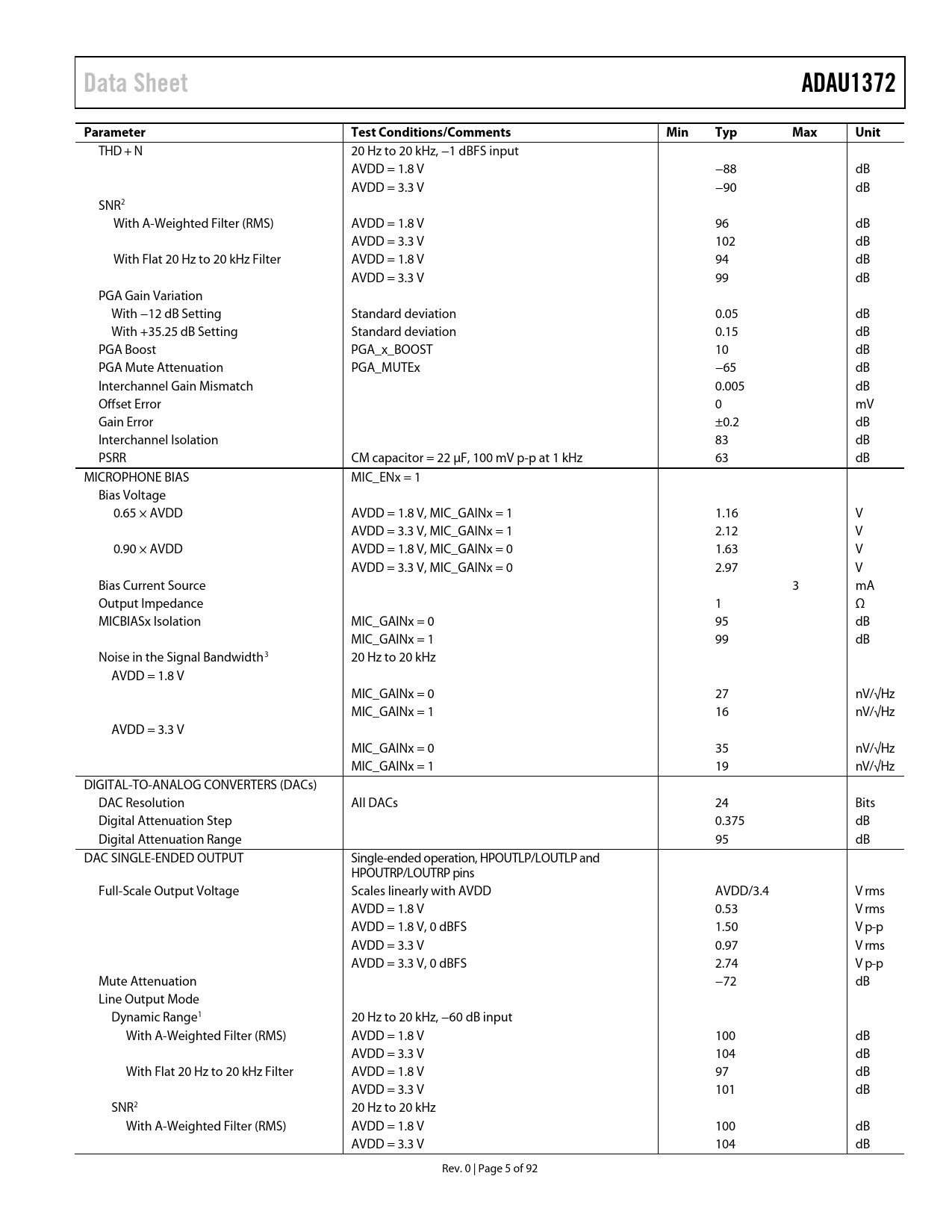 Páginas / Página92 / 5 — Data Sheet. ADAU1372. Parameter. Test Conditions/Comments. Min. Typ. Max. …
