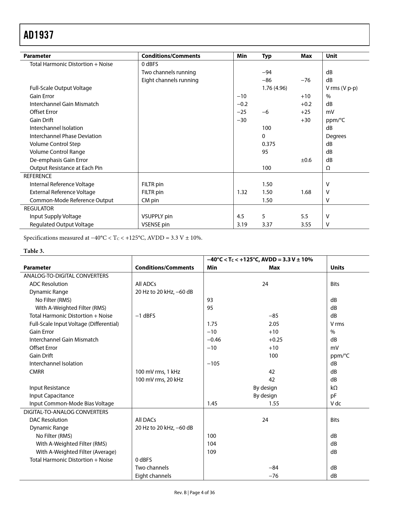 AD1937Parameter Conditions/CommentsMinTypMaxUnit Total Harmonic Distortion + Noise 0 dBFS Two channels running −94 dB Eight channels running −86 −76 dB Full-Scale Output Voltage 1.76 (4.96) V rms (V p-p) Gain Error −10 +10 % Interchannel Gain Mismatch −0.2 +0.2 dB Offset Error −25 −6 +25 mV Gain Drift −30 +30 ppm/°C Interchannel Isolation 100 dB Interchannel Phase Deviation 0 Degrees Volume Control Step 0.375 dB Volume Control Range 95 dB De-emphasis Gain Error ±0.6 dB Output Resistance at Each Pin 100 Ω REFERENCE Internal Reference Voltage FILTR pin 1.50 V External Reference Voltage FILTR pin 1.32 1.50 1.68 V Common-Mode Reference Output CM pin 1.50 V REGULATOR Input Supply Voltage VSUPPLY pin 4.5 5 5.5 V Regulated Output Voltage VSENSE pin 3.19 3.37 3.55 V Specifications measured at −40°C < TC < +125°C, AVDD = 3.3 V ± 10%. Table 3.−40°C<TC < +125°C, AVDD = 3.3 V ± 10%Parameter Conditions/CommentsMinMaxUnits ANALOG-TO-DIGITAL CONVERTERS ADC Resolution All ADCs 24 Bits Dynamic Range 20 Hz to 20 kHz, −60 dB No Filter (RMS) 93 dB With A-Weighted Filter (RMS) 95 dB Total Harmonic Distortion + Noise −1 dBFS −85 dB Full-Scale Input Voltage (Differential) 1.75 2.05 V rms Gain Error −10 +10 % Interchannel Gain Mismatch −0.46 +0.25 dB Offset Error −10 +10 mV Gain Drift 100 ppm/°C Interchannel Isolation −105 dB CMRR 100 mV rms, 1 kHz 42 dB 100 mV rms, 20 kHz 42 dB Input Resistance By design kΩ Input Capacitance By design pF Input Common-Mode Bias Voltage 1.45 1.55 V dc DIGITAL-TO-ANALOG CONVERTERS DAC Resolution All DACs 24 Bits Dynamic Range 20 Hz to 20 kHz, −60 dB No Filter (RMS) 100 dB With A-Weighted Filter (RMS) 104 dB With A-Weighted Filter (Average) 109 dB Total Harmonic Distortion + Noise 0 dBFS Two channels −84 dB Eight channels −76 dB Rev. B | Page 4 of 36 Document Outline FEATURES APPLICATIONS GENERAL DESCRIPTION FUNCTIONAL BLOCK DIAGRAM TABLE OF CONTENTS REVISION HISTORY SPECIFICATIONS TEST CONDITIONS ANALOG PERFORMANCE SPECIFICATIONS CRYSTAL OSCILLATOR SPECIFICATIONS DIGITAL SPECIFICATIONS POWER SUPPLY SPECIFICATIONS DIGITAL FILTERS TIMING SPECIFICATIONS TIMING DIAGRAMS ABSOLUTE MAXIMUM RATINGS THERMAL RESISTANCE ESD CAUTION PIN CONFIGURATION AND FUNCTION DESCRIPTIONS TYPICAL PERFORMANCE CHARACTERISTICS THEORY OF OPERATION ANALOG-TO-DIGITAL CONVERTERS (ADCs) DIGITAL-TO-ANALOG CONVERTERS (DACs) CLOCK SIGNALS RESET AND POWER-DOWN I2C CONTROL PORT POWER SUPPLY AND VOLTAGE REFERENCE SERIAL DATA PORTS—DATA FORMAT TIME-DIVISION MULTIPLEXED (TDM) MODES DAISY-CHAIN MODE ADDITIONAL MODES CONTROL REGISTERS DEFINITIONS PLL AND CLOCK CONTROL REGISTERS DAC CONTROL REGISTERS ADC CONTROL REGISTERS APPLICATIONS CIRCUITS OUTLINE DIMENSIONS ORDERING GUIDE AUTOMOTIVE PRODUCTS