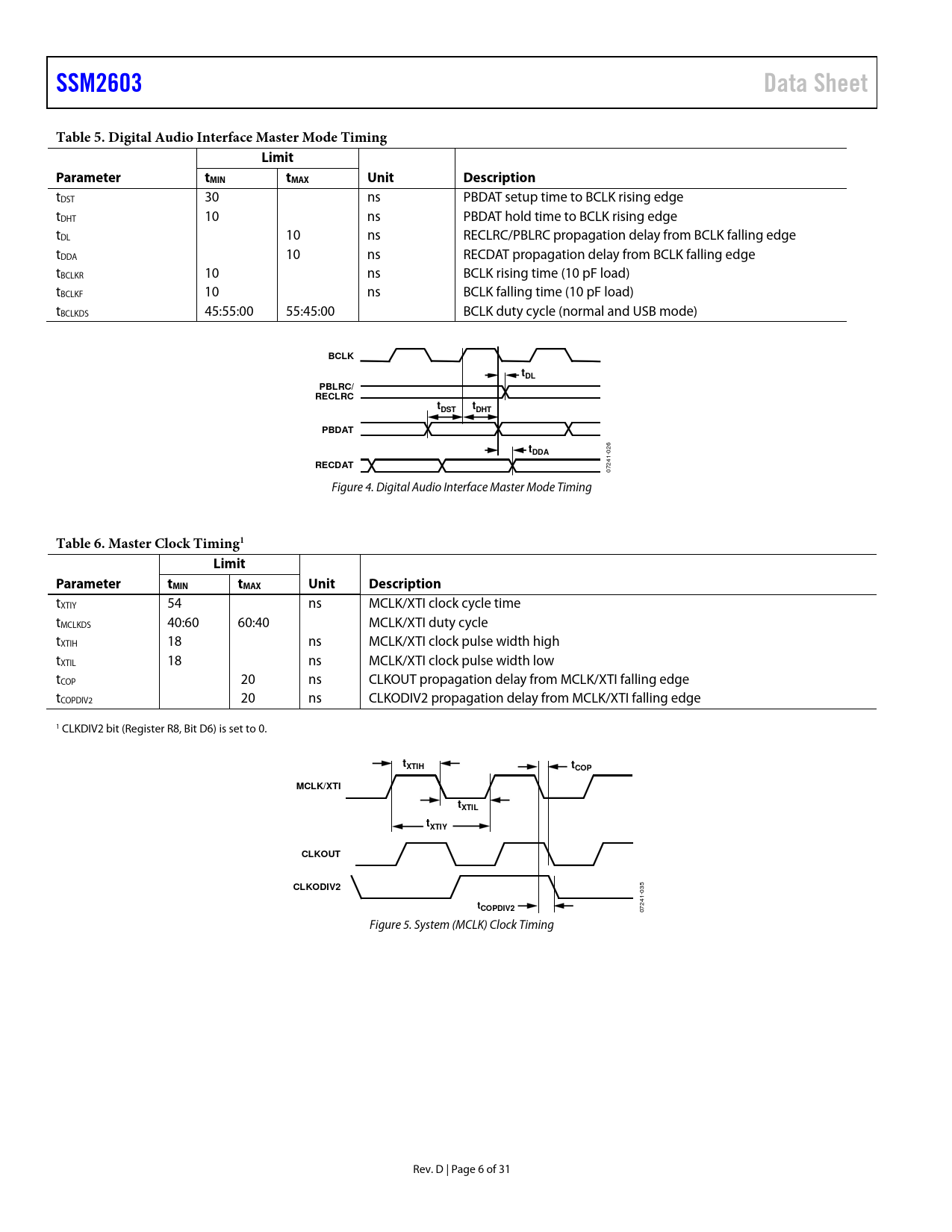 | Páginas / Página | 31 / 6 — SSM2603. Data Sheet. Table 5. Digital Audio Interface Master Mode Timing … |