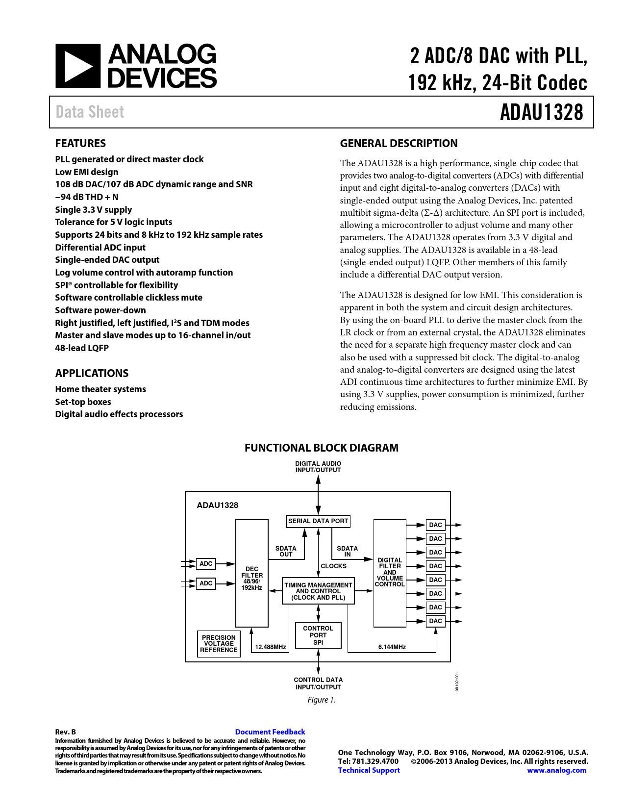 2 ADC/8 DAC with PLL,. 192 kHz, 24-Bit Codec. Data Sheet. ADAU1328. FEATURES. GENERAL DESCRIPTION