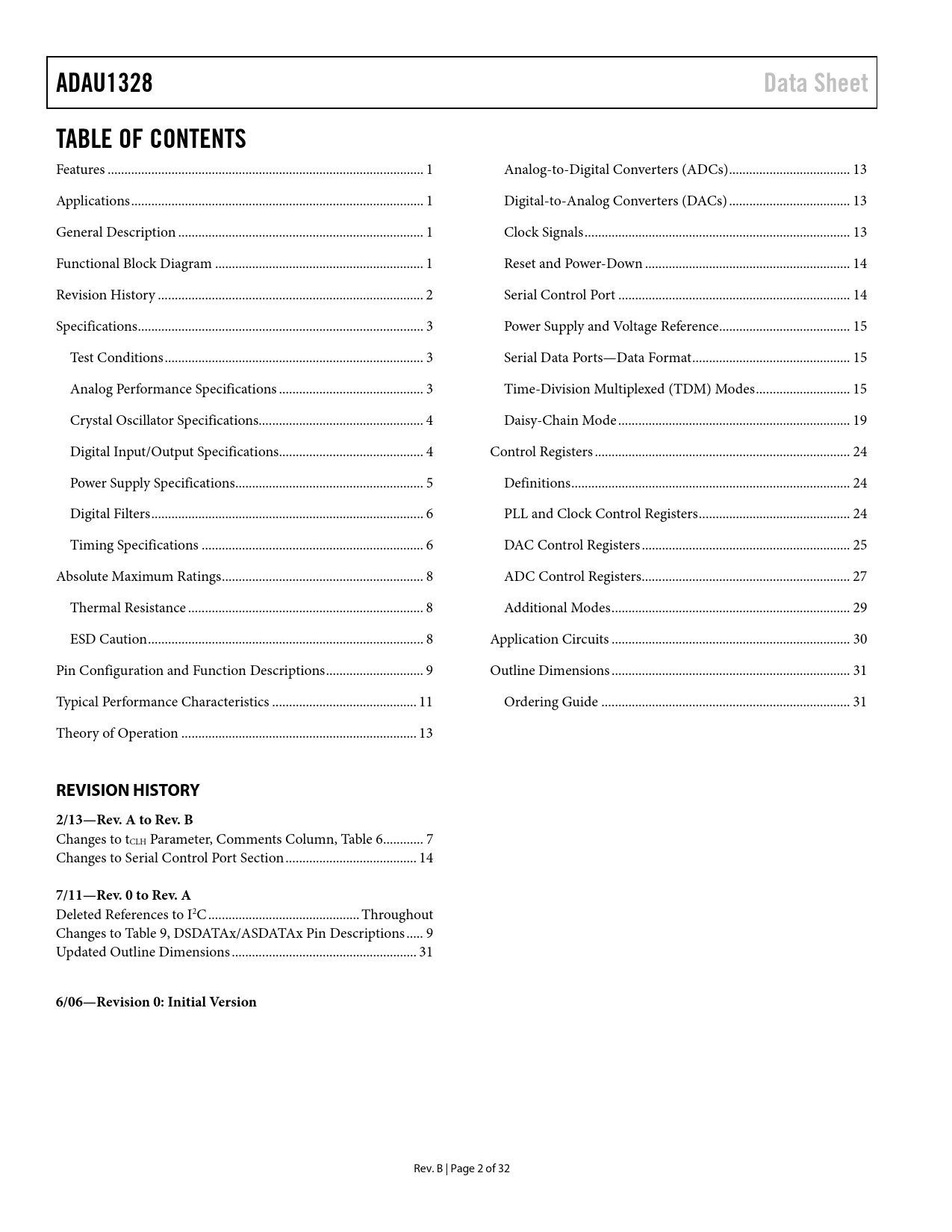 ADAU1328 Data Sheet TABLE OF CONTENTS REVISION HISTORY 2/13—Rev A to Rev B 7/11—Rev 0 to Rev A