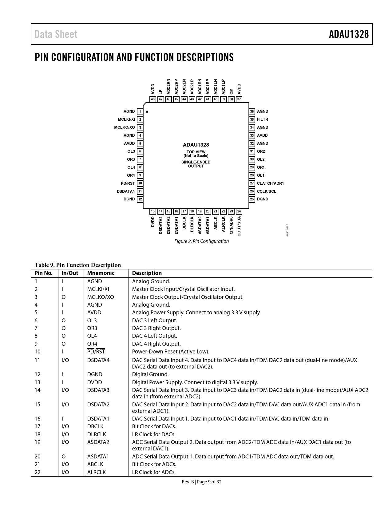 Páginas / Página32 / 9 — Data Sheet. ADAU1328. PIN CONFIGURATION AND FUNCTION DESCRIPTIONS. …