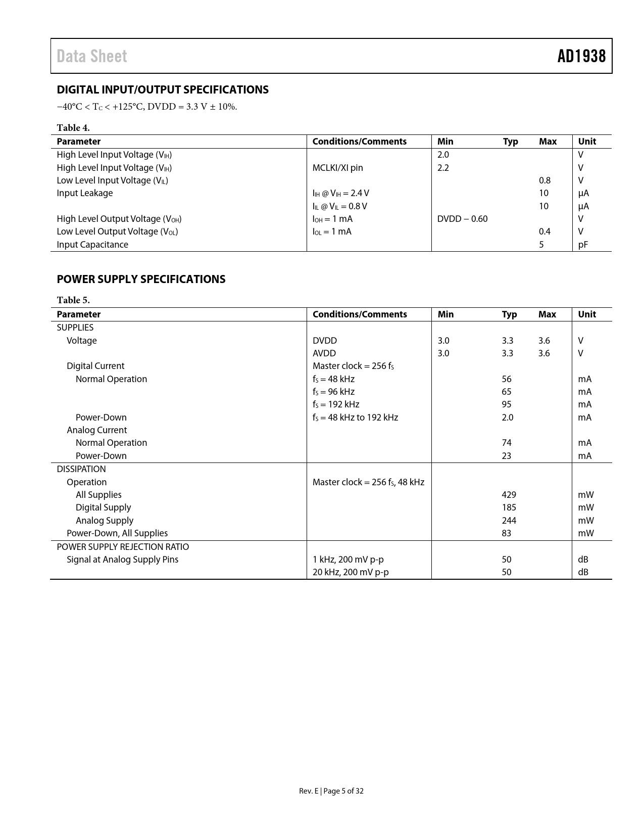 Páginas / Página32 / 5 — Data Sheet. AD1938. DIGITAL INPUT/OUTPUT SPECIFICATIONS. Table 4. …