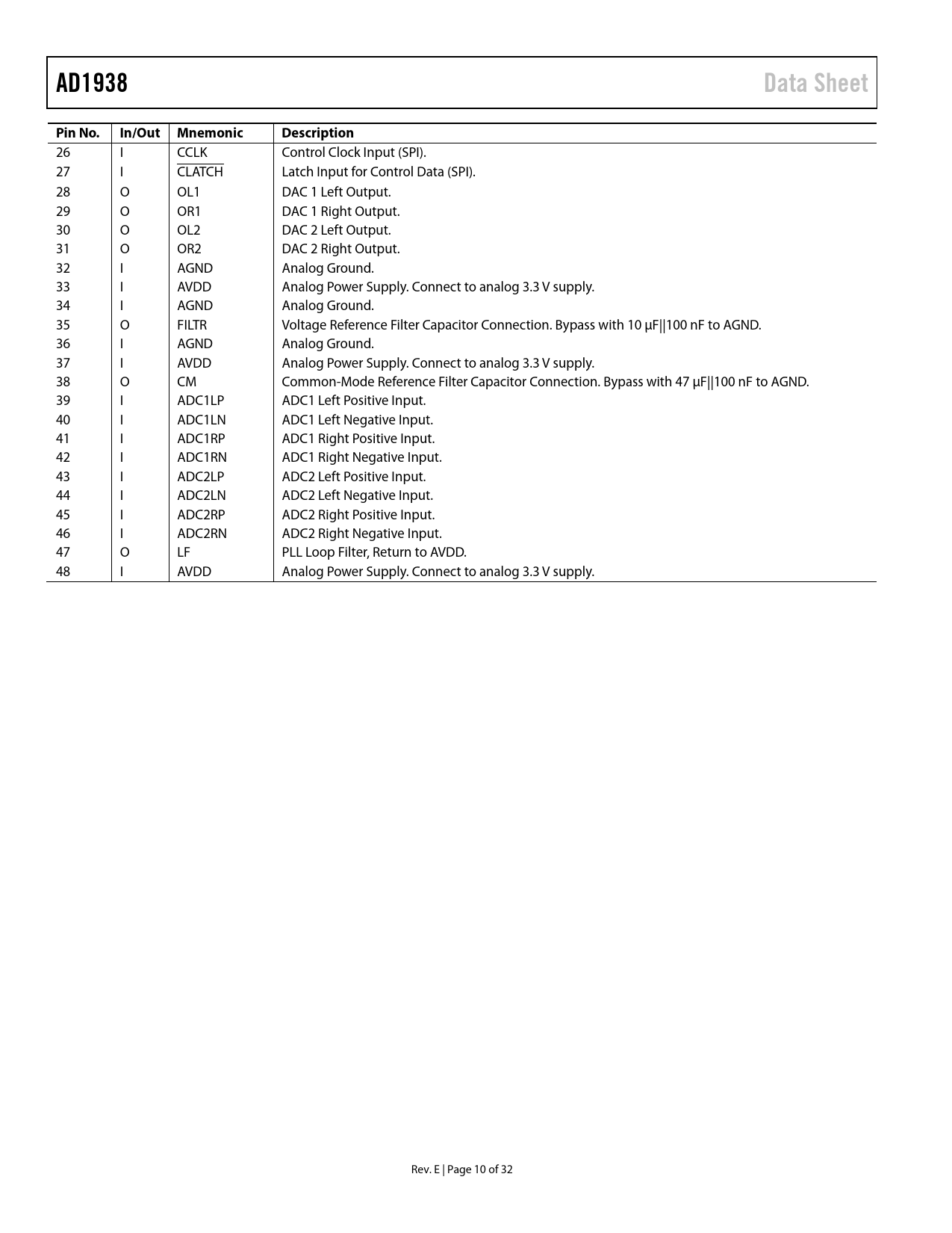 AD1938 Data Sheet Pin No In/Out Mnemonic Description