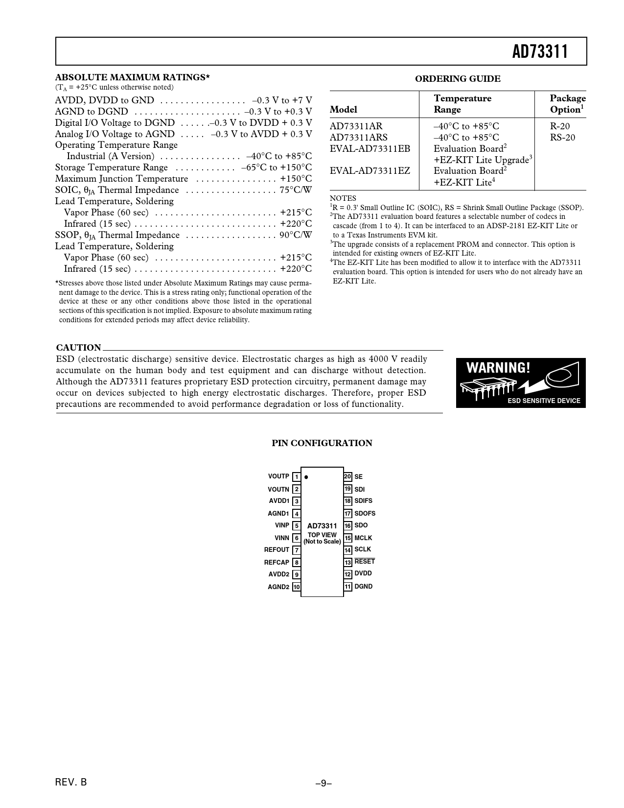 AD73311ABSOLUTE MAXIMUM RATINGS*ORDERING GUIDE (TA = +25°C unless otherwise noted) AVDD, DVDD to GND . –0.3 V to +7 V TemperaturePackage AGND to DGND . –0.3 V to +0.3 V ModelRangeOption1 Digital I/O Voltage to DGND . .–0.3 V to DVDD + 0.3 V AD73311AR –40°C to +85°C R-20 Analog I/O Voltage to AGND . –0.3 V to AVDD + 0.3 V AD73311ARS –40°C to +85°C RS-20 Operating Temperature Range EVAL-AD73311EB Evaluation Board2 Industrial (A Version) . –40°C to +85°C +EZ-KIT Lite Upgrade3 Storage Temperature Range . –65°C to +150°C EVAL-AD73311EZ Evaluation Board2 Maximum Junction Temperature . +150°C +EZ-KIT Lite4 SOIC, θJA Thermal Impedance . 75°C/W Lead Temperature, Soldering NOTES 1R = 0.3' Small Outline IC (SOIC), RS = Shrink Small Outline Package (SSOP). Vapor Phase (60 sec) . +215°C 2The AD73311 evaluation board features a selectable number of codecs in Infrared (15 sec) . +220°C cascade (from 1 to 4). It can be interfaced to an ADSP-2181 EZ-KIT Lite or SSOP, θJA Thermal Impedance . 90°C/W to a Texas Instruments EVM kit. 3 Lead Temperature, Soldering The upgrade consists of a replacement PROM and connector. This option is Vapor Phase (60 sec) . +215°C intended for existing owners of EZ-KIT Lite. 4The EZ-KIT Lite has been modified to allow it to interface with the AD73311 Infrared (15 sec) . +220°C evaluation board. This option is intended for users who do not already have an *Stresses above those listed under Absolute Maximum Ratings may cause perma- EZ-KIT Lite. nent damage to the device. This is a stress rating only; functional operation of the device at these or any other conditions above those listed in the operational sections of this specification is not implied. Exposure to absolute maximum rating conditions for extended periods may affect device reliability. CAUTION ESD (electrostatic discharge) sensitive device. Electrostatic charges as high as 4000 V readily accumulate on the human body and test equipment and can discharge without detection. WARNING! Although the AD73311 features proprietary ESD protection circuitry, permanent damage may occur on devices subjected to high energy electrostatic discharges. Therefore, proper ESD precautions are recommended to avoid performance degradation or loss of functionality. ESD SENSITIVE DEVICEPIN CONFIGURATIONVOUTP120 SEVOUTN219 SDIAVDD1 318 SDIFSAGND1417 SDOFSVINP5AD7331116 SDOVINN6TOP VIEW15 MCLK(Not to Scale)REFOUT714 SCLKREFCAP813 RESETAVDD2912 DVDDAGND2 1011 DGND REV. B –9–