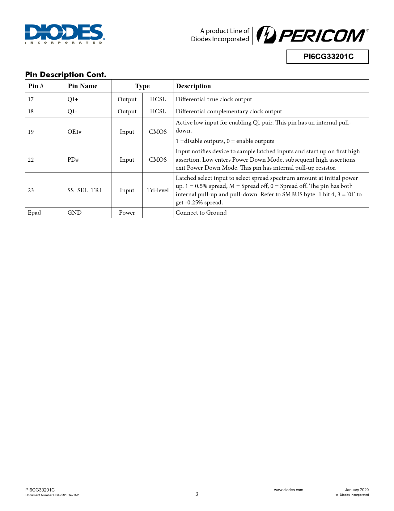 PI6CG33201C. Pin Description Cont. Pin #. Pin Name. Type. Description