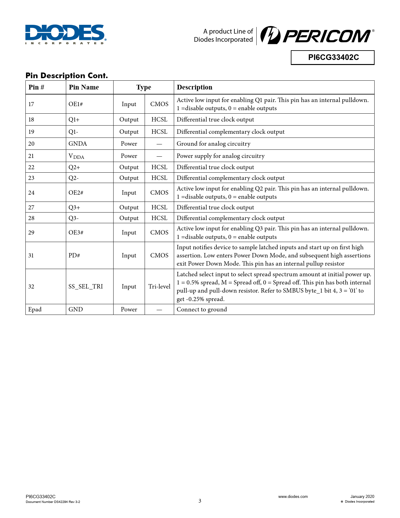 PI6CG33402C. Pin Description Cont. Pin #. Pin Name. Type. Description