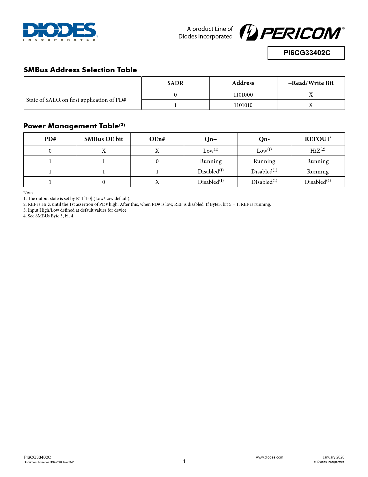 A product Line of Diodes Incorporated PI6CG33402CSMBus Address Selection TableSADRAddress+Read/Write Bit 0 1101000 X State of SADR on first application of PD# 1 1101010 X Power Management Table(3)PD#SMBus OE bitOEn#Qn+Qn-REFOUT 0 X X Low(1) Low(1) HiZ(2) 1 1 0 Running Running Running 1 1 1 Disabled(1) Disabled(1) Running 1 0 X Disabled(1) Disabled(1) Disabled(4) Note: 1. The output state is set by B11[1:0] (Low/Low default). 2. REF is Hi-Z until the 1st assertion of PD# high. After this, when PD# is low, REF is disabled. If Byte3, bit 5 = 1, REF is running. 3. Input High/Low defined at default values for device. 4. See SMBUs Byte 3, bit 4. PI6CG33402C www.diodes.com January 2020 Document Number DS42294 Rev 3-2 4 Diodes Incorporated