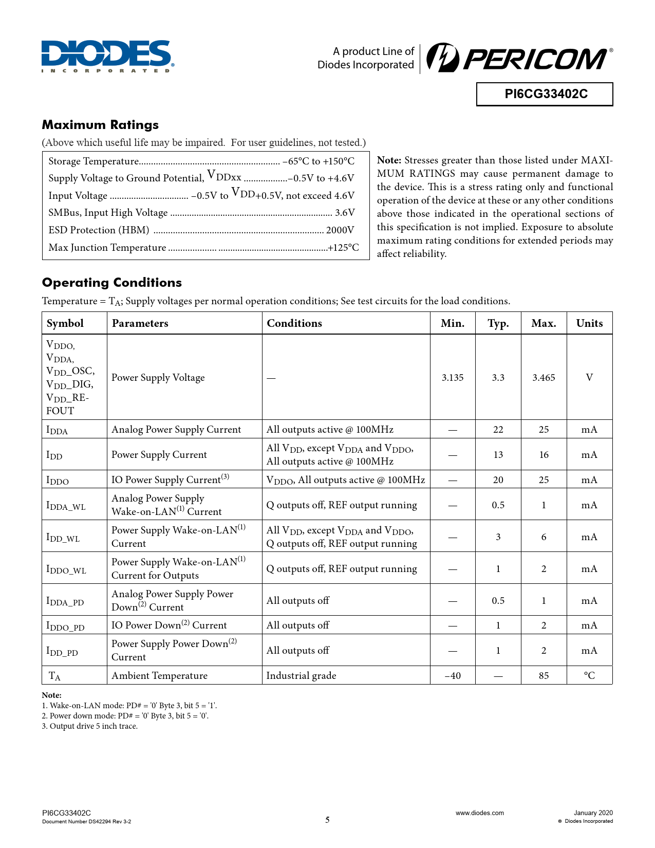 A product Line of Diodes Incorporated PI6CG33402CMaximum Ratings (Above which useful life may be impaired. For user guidelines, not tested.) Storage Temperature .. –65°C to +150°C Note: Stresses greater than those listed under MAXI- Supply Voltage to Ground Potential, VDDxx ..–0.5V to +4.6V MUM RATINGS may cause permanent damage to the device. This is a stress rating only and functional Input Voltage ... –0.5V to VDD+0.5V, not exceed 4.6V operation of the device at these or any other conditions SMBus, Input High Voltage .. 3.6V above those indicated in the operational sections of ESD Protection (HBM) .. 2000V this specification is not implied. Exposure to absolute Max Junction Temperature .. ..+125°C maximum rating conditions for extended periods may affect reliability. Operating Conditions Temperature = TA; Supply voltages per normal operation conditions; See test circuits for the load conditions. SymbolParametersConditionsMin.Typ.Max.Units VDDO, VDDA, VDD_OSC, V Power Supply Voltage — 3.135 3.3 3.465 V DD_DIG, VDD_RE- FOUT IDDA Analog Power Supply Current All outputs active @ 100MHz — 22 25 mA IDD Power Supply Current All VDD, except VDDA and VDDO, All outputs active @ 100MHz — 13 16 mA IDDO IO Power Supply Current(3) VDDO, All outputs active @ 100MHz — 20 25 mA I Analog Power Supply DDA_WL Wake-on-LAN(1) Current Q outputs off, REF output running — 0.5 1 mA I Power Supply Wake-on-LAN(1) All VDD, except VDDA and VDDO, DD_WL Current Q outputs off, REF output running — 3 6 mA I Power Supply Wake-on-LAN(1) DDO_WL Current for Outputs Q outputs off, REF output running — 1 2 mA I Analog Power Supply Power DDA_PD Down(2) Current All outputs off — 0.5 1 mA IDDO_PD IO Power Down(2) Current All outputs off — 1 2 mA I Power Supply Power Down(2) DD_PD Current All outputs off — 1 2 mA TA Ambient Temperature Industrial grade –40 — 85 °C Note: 1. Wake-on-LAN mode: PD# = '0' Byte 3, bit 5 = '1'. 2. Power down mode: PD# = '0' Byte 3, bit 5 = '0'. 3. Output drive 5 inch trace. PI6CG33402C www.diodes.com January 2020 Document Number DS42294 Rev 3-2 5 Diodes Incorporated