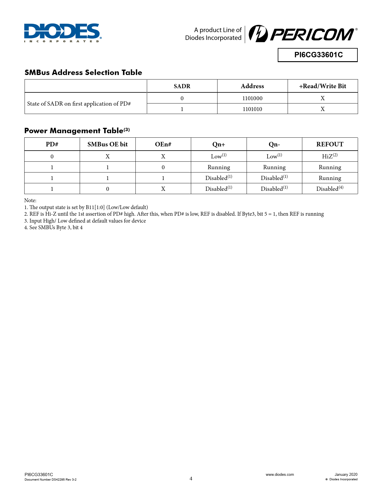 PI6CG33601C. SMBus Address Selection Table. SADR. Address. +Read/Write Bit. Power Management Table(3). PD#. SMBus OE bit. OEn#. Qn+. Qn-