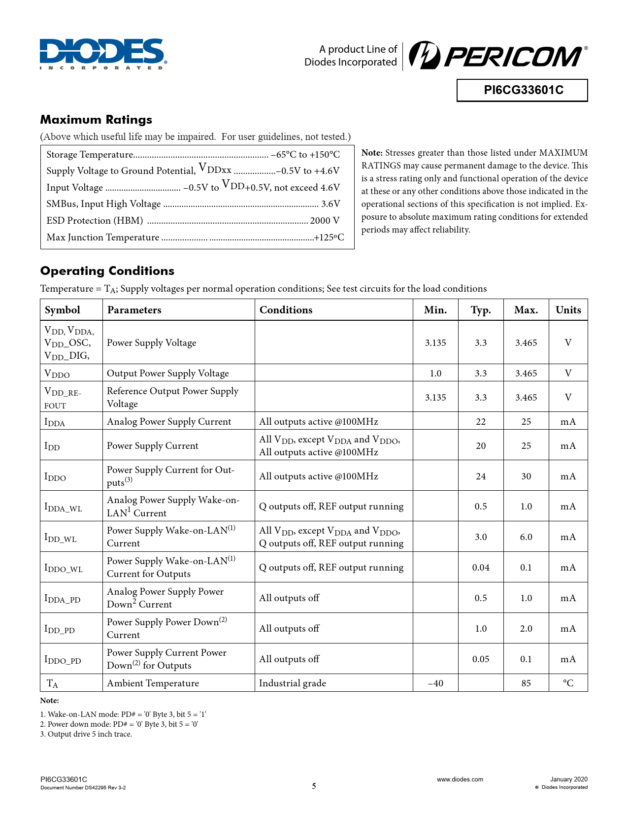 A product Line of Diodes Incorporated PI6CG33601CMaximum Ratings (Above which useful life may be impaired. For user guidelines, not tested.) Storage Temperature .. –65°C to +150°C Note: Stresses greater than those listed under MAXIMUM Supply Voltage to Ground Potential, VDDxx ..–0.5V to +4.6V RATINGS may cause permanent damage to the device. This is a stress rating only and functional operation of the device Input Voltage ... –0.5V to VDD+0.5V, not exceed 4.6V at these or any other conditions above those indicated in the SMBus, Input High Voltage .. 3.6V operational sections of this specification is not implied. Ex- ESD Protection (HBM) ... 2000 V posure to absolute maximum rating conditions for extended periods may affect reliability. Max Junction Temperature ..+125ºC Operating Conditions Temperature = TA; Supply voltages per normal operation conditions; See test circuits for the load conditions SymbolParametersConditionsMin.Typ.Max.Units VDD, VDDA, VDD_OSC, Power Supply Voltage 3.135 3.3 3.465 V VDD_DIG, VDDO Output Power Supply Voltage 1.0 3.3 3.465 V VDD_RE- Reference Output Power Supply FOUT Voltage 3.135 3.3 3.465 V IDDA Analog Power Supply Current All outputs active @100MHz 22 25 mA IDD Power Supply Current All VDD, except VDDA and VDDO, All outputs active @100MHz 20 25 mA I Power Supply Current for Out- DDO puts(3) All outputs active @100MHz 24 30 mA I Analog Power Supply Wake-on- DDA_WL LAN1 Current Q outputs off, REF output running 0.5 1.0 mA I Power Supply Wake-on-LAN(1) All VDD, except VDDA and VDDO, DD_WL Current Q outputs off, REF output running 3.0 6.0 mA I Power Supply Wake-on-LAN(1) DDO_WL Current for Outputs Q outputs off, REF output running 0.04 0.1 mA I Analog Power Supply Power DDA_PD Down2 Current All outputs off 0.5 1.0 mA I Power Supply Power Down(2) DD_PD Current All outputs off 1.0 2.0 mA I Power Supply Current Power DDO_PD Down(2) for Outputs All outputs off 0.05 0.1 mA TA Ambient Temperature Industrial grade –40 85 °C Note: 1. Wake-on-LAN mode: PD# = '0' Byte 3, bit 5 = '1' 2. Power down mode: PD# = '0' Byte 3, bit 5 = '0' 3. Output drive 5 inch trace. PI6CG33601C www.diodes.com January 2020 Document Number DS42295 Rev 3-2 5 Diodes Incorporated