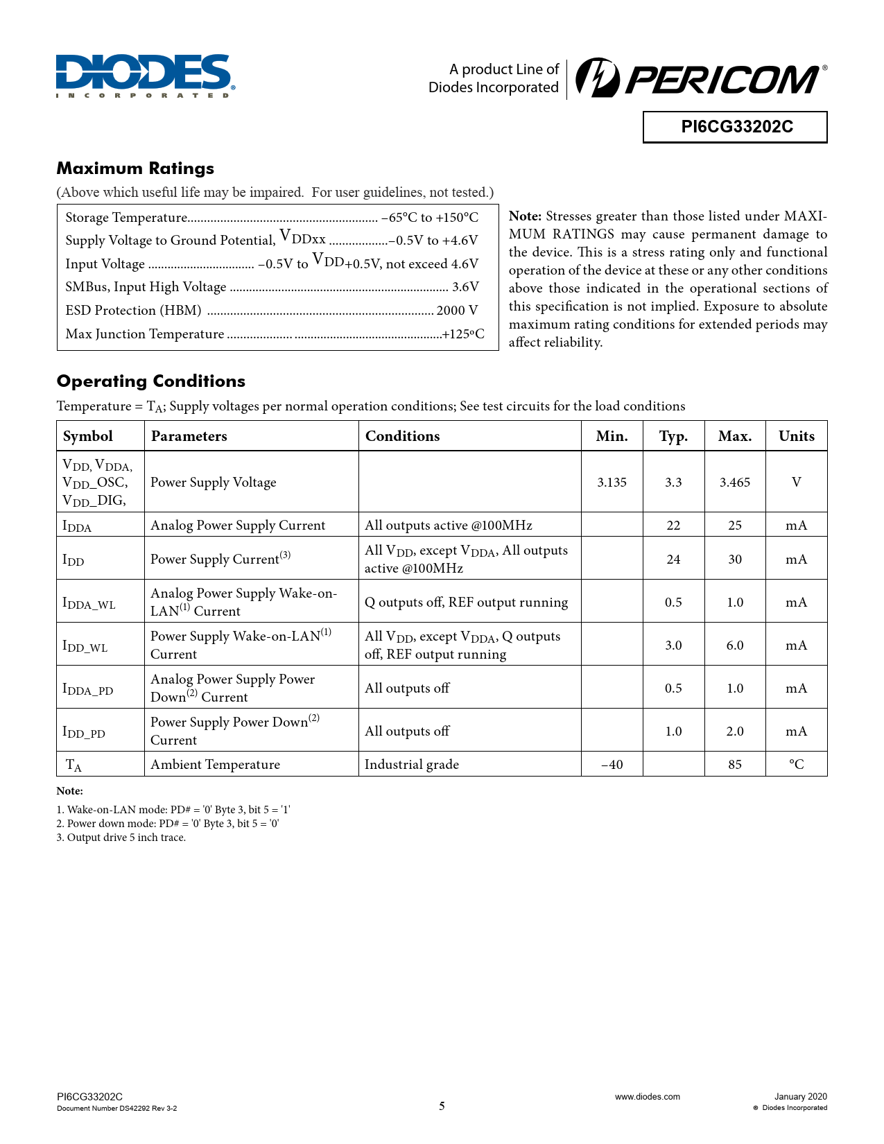 1. Wake-on-LAN mode: PD# = '0' Byte 3, bit 5 = '1' 2. Power down mode: PD# = '0' Byte 3, bit 5 = '0' 3. Output drive 5 inch trace. PI6CG33202C www.diodes.com January 2020 Document Number DS42292 Rev 3-2 5 Diodes Incorporated