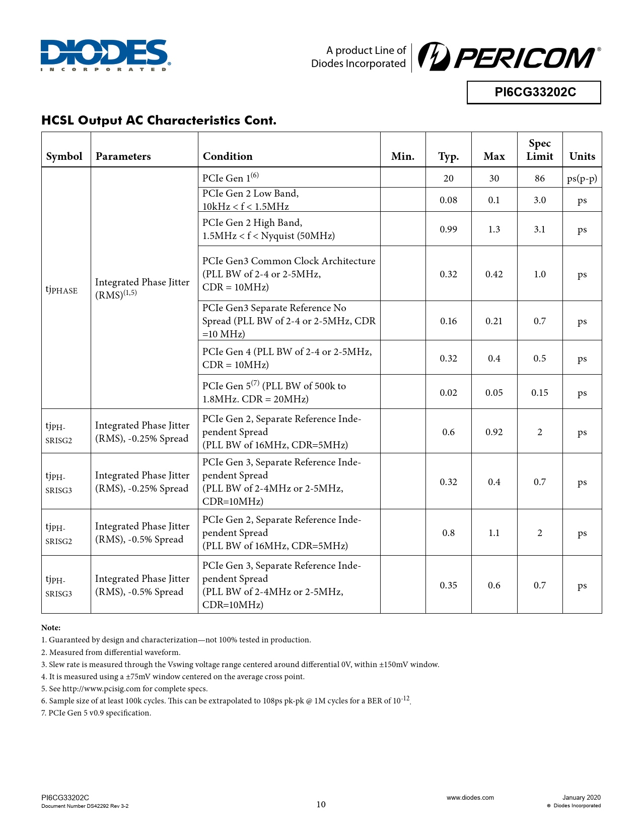 PI6CG33202C HCSL Output AC Characteristics Cont Spec Symbol Parameters Condition Min Typ Max Limit Units Note: