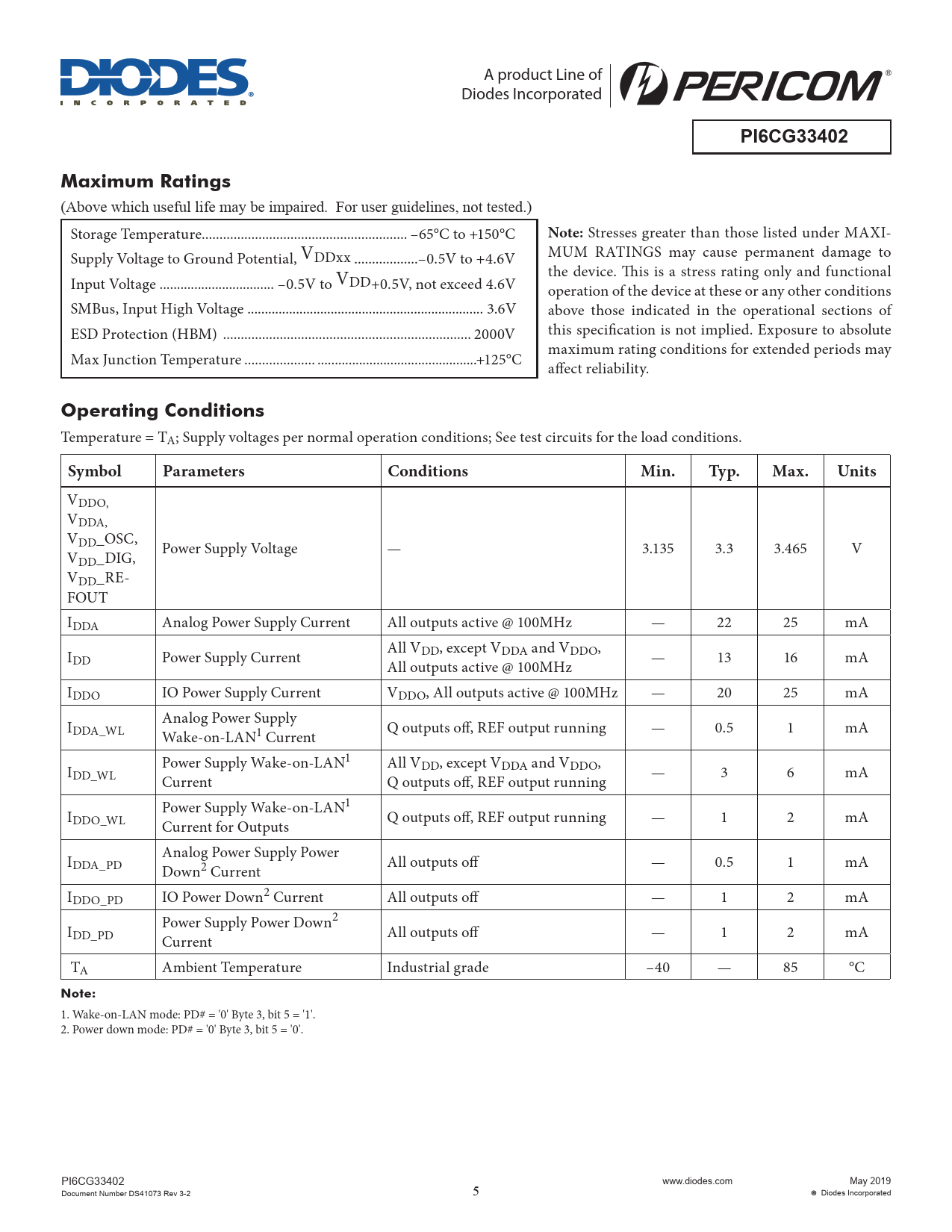 A product Line of Diodes Incorporated PI6CG33402Maximum Ratings (Above which useful life may be impaired. For user guidelines, not tested.) Storage Temperature .. –65°C to +150°C Note: Stresses greater than those listed under MAXI- Supply Voltage to Ground Potential, VDDxx ..–0.5V to +4.6V MUM RATINGS may cause permanent damage to the device. This is a stress rating only and functional Input Voltage ... –0.5V to VDD+0.5V, not exceed 4.6V operation of the device at these or any other conditions SMBus, Input High Voltage .. 3.6V above those indicated in the operational sections of ESD Protection (HBM) .. 2000V this specification is not implied. Exposure to absolute Max Junction Temperature .. ..+125°C maximum rating conditions for extended periods may affect reliability. Operating Conditions Temperature = TA; Supply voltages per normal operation conditions; See test circuits for the load conditions. SymbolParametersConditionsMin.Typ.Max.Units VDDO, VDDA, VDD_OSC, V Power Supply Voltage — 3.135 3.3 3.465 V DD_DIG, VDD_RE- FOUT IDDA Analog Power Supply Current All outputs active @ 100MHz — 22 25 mA IDD Power Supply Current All VDD, except VDDA and VDDO, All outputs active @ 100MHz — 13 16 mA IDDO IO Power Supply Current VDDO, All outputs active @ 100MHz — 20 25 mA I Analog Power Supply DDA_WL Wake-on-LAN1 Current Q outputs off, REF output running — 0.5 1 mA I Power Supply Wake-on-LAN1 All VDD, except VDDA and VDDO, DD_WL Current Q outputs off, REF output running — 3 6 mA I Power Supply Wake-on-LAN1 DDO_WL Current for Outputs Q outputs off, REF output running — 1 2 mA I Analog Power Supply Power DDA_PD Down2 Current All outputs off — 0.5 1 mA IDDO_PD IO Power Down2 Current All outputs off — 1 2 mA I Power Supply Power Down2 DD_PD Current All outputs off — 1 2 mA TA Ambient Temperature Industrial grade –40 — 85 °C Note: 1. Wake-on-LAN mode: PD# = '0' Byte 3, bit 5 = '1'. 2. Power down mode: PD# = '0' Byte 3, bit 5 = '0'. PI6CG33402 www.diodes.com May 2019 Document Number DS41073 Rev 3-2 5 Diodes Incorporated