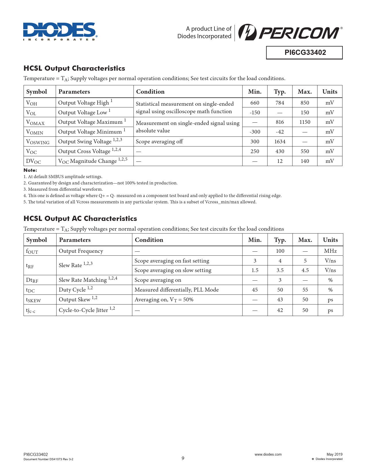 PI6CG33402. HCSL Output Characteristics. Symbol. Parameters. Condition. Min. Typ. Max. Units. Note:. HCSL Output AC Characteristics